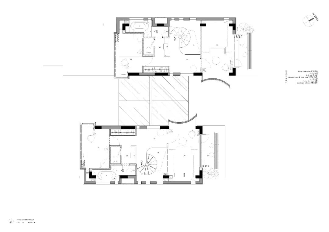 Z轴的空间序列:Z轴为垂直高度向的空间实践。秦岭山脉在Z轴呈现盘错而上的趋势,并且在悬崖与溪流的直线落差间体现的淋漓尽致。「空山九帖」设双Z轴体系,其一,为建筑北侧与短桥并置的垂直天井,由此分离了外走廊与客房门檐,塑造入户场景的片断性;其二,为跃层套房内的垂直天井,串联二层北侧入户与一层北侧出户直至悬崖前的纵向动线连接。