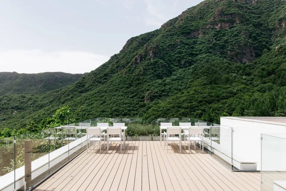 在连续的视觉线索设计中,视线从山路开始望向无尽的秦岭,至平行于山崖的建筑被阻挡,视线在微妙变化的路径中经由斜桥、公区、悬桥、短桥、玄关、起居、卧房终至阳台,在阳台驻足,视线线索正是成为行为的引导,将不同属性的若干层空间联结起来。人在山路行走望见被轻轻抬高的「空山九帖」,能看见草甸延续至建筑后方,后方的景色却被建筑控制和遮掩。进入客房,能够看见藏身于玄关一隅的秦岭框景,引导人向前探索。移步阳台,隔岸的山林与山脉再无遮挡的显现于面前。视野彷佛可以随着山势向上移动,至天空与山的交界处。视野的骤变为人带来强烈的情感冲击,使人从现实时空瞬移到秦岭猿鸣遍山的古境,沉浸于秦岭静寂而广袤的山脉中。