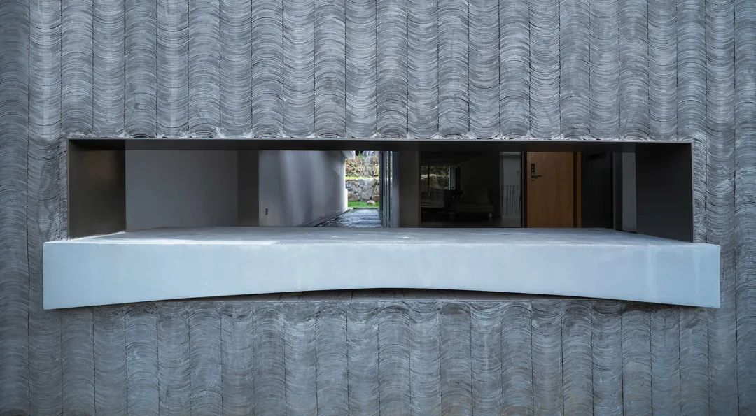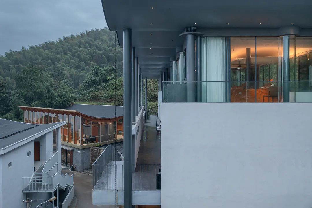 从大场景到小场景的空间序列。从「空山九帖·秦岭」前蜿蜒的山路至建筑另一侧面向山峦的阳台,沿着这组空间流线是连续的、充满仪式感的行走体验。建筑前的山路置于秦岭山脉中,宏大的山脉从山路两侧倾泻而下,场景宏大而行人微小。当跟随山路行至建筑外廊,一段由混凝土浇灌的悬板框住短桥,连接着客房与外廊。悬板与短桥形成了与山径截然不同的空间体验:踏入平行于建筑主体的悬桥,人体90度转向,身体被悬桥与独立片墙构筑物夹持,空间维度横向收缩,景深顺势延展,构成「空山九帖」独特的户外门廊系统。