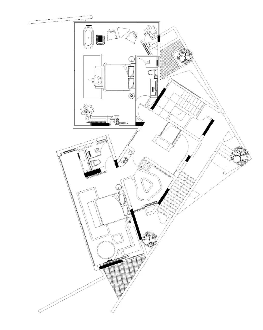 各房间硕大的玻璃窗,突破了建筑表皮的束缚,面向不同的角度与高度透露出室内空间与自然接触的迥异态度:或眺望远山的风景,或近赏建筑周边的野生植被,也可以走上露台抚摸树冠上的新叶。卷曲的形态围绕出一个不规则的天井,并在保留的树木旁开辟一潭五平方米的温泉泡池,享受自然创造出来的景观与温度。围绕天井的立面完全通透,可在此享受池中的良辰美景。