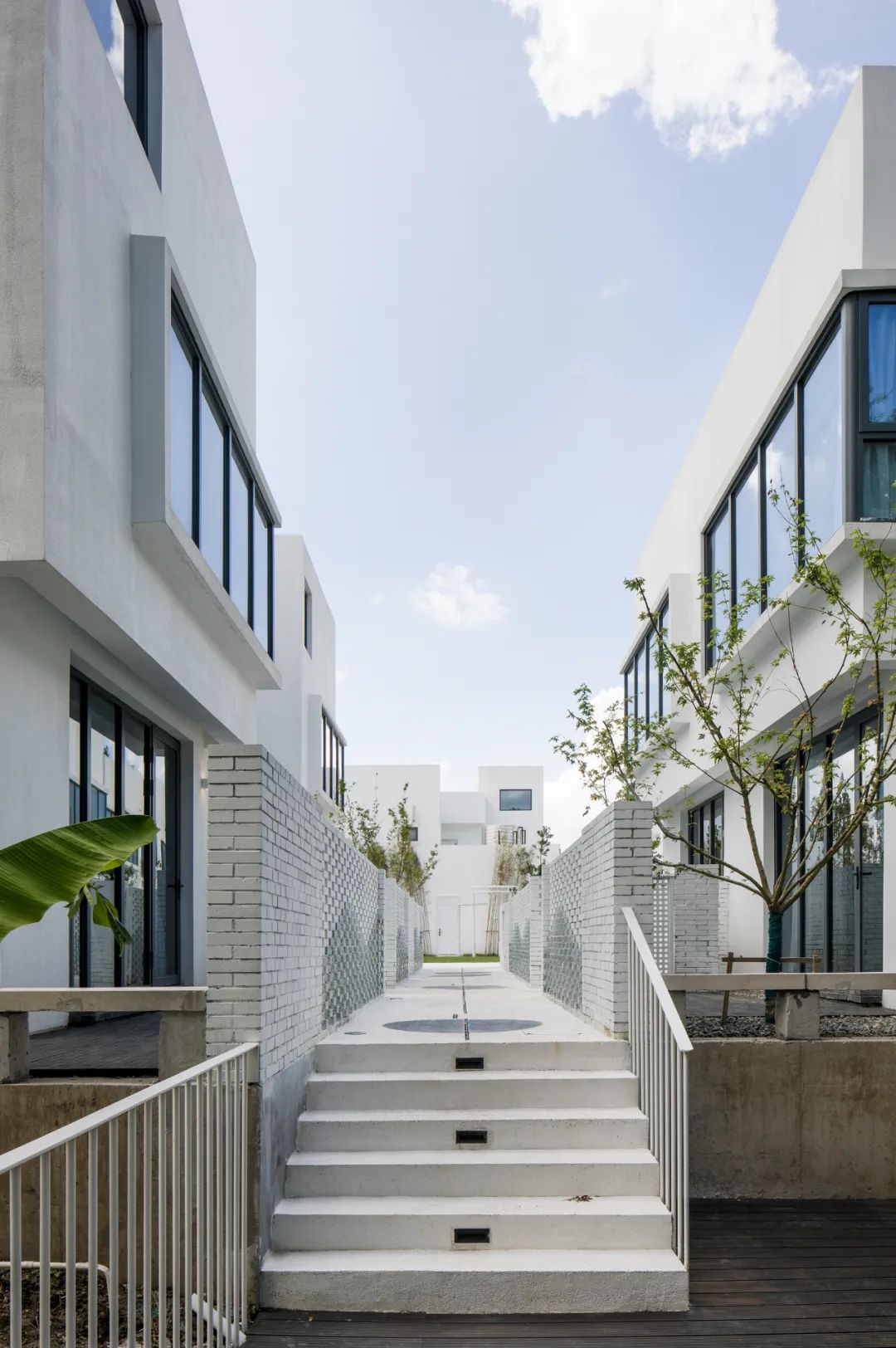 ▲两侧布置花架的楼梯间