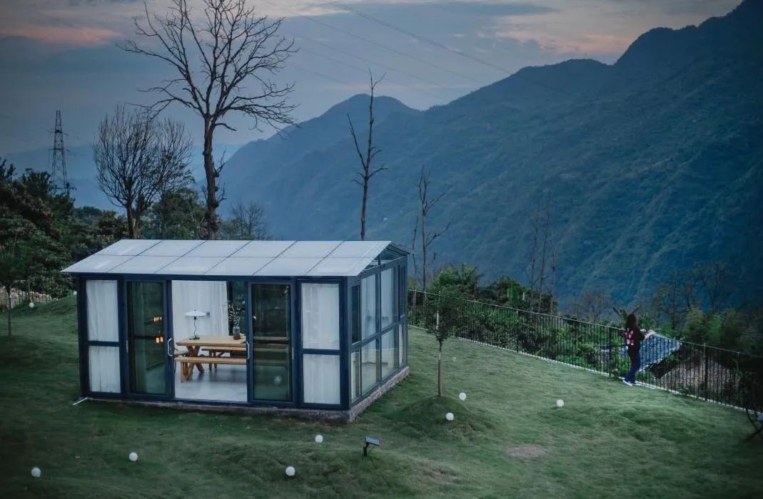 建筑的交通空间全部以半室外空间 的形式对周围的环境开放,串联起每一层的室外庭院和每一间客房。意图让居住者从中获得行走于村落巷道中的空间体验。建筑每一层都 设置了庭院,大大小小的院落立体地分布在建筑当中,产生丰富的活 动可能性,构建了丰富的室外空间。建筑强调与自然关系的和谐,整体面向山谷水平方向延展,如同在拥抱山林、呼应山谷的回音。客房在面向山谷景观的方向尽可能多采用玻璃,以加强景观视野的开阔与通透。除了客房可以透过窗户看到自然的美景,民宿开放了许多半室外的公共空间,行走其中更能够走入环境中,用所有的感官去体验交流。