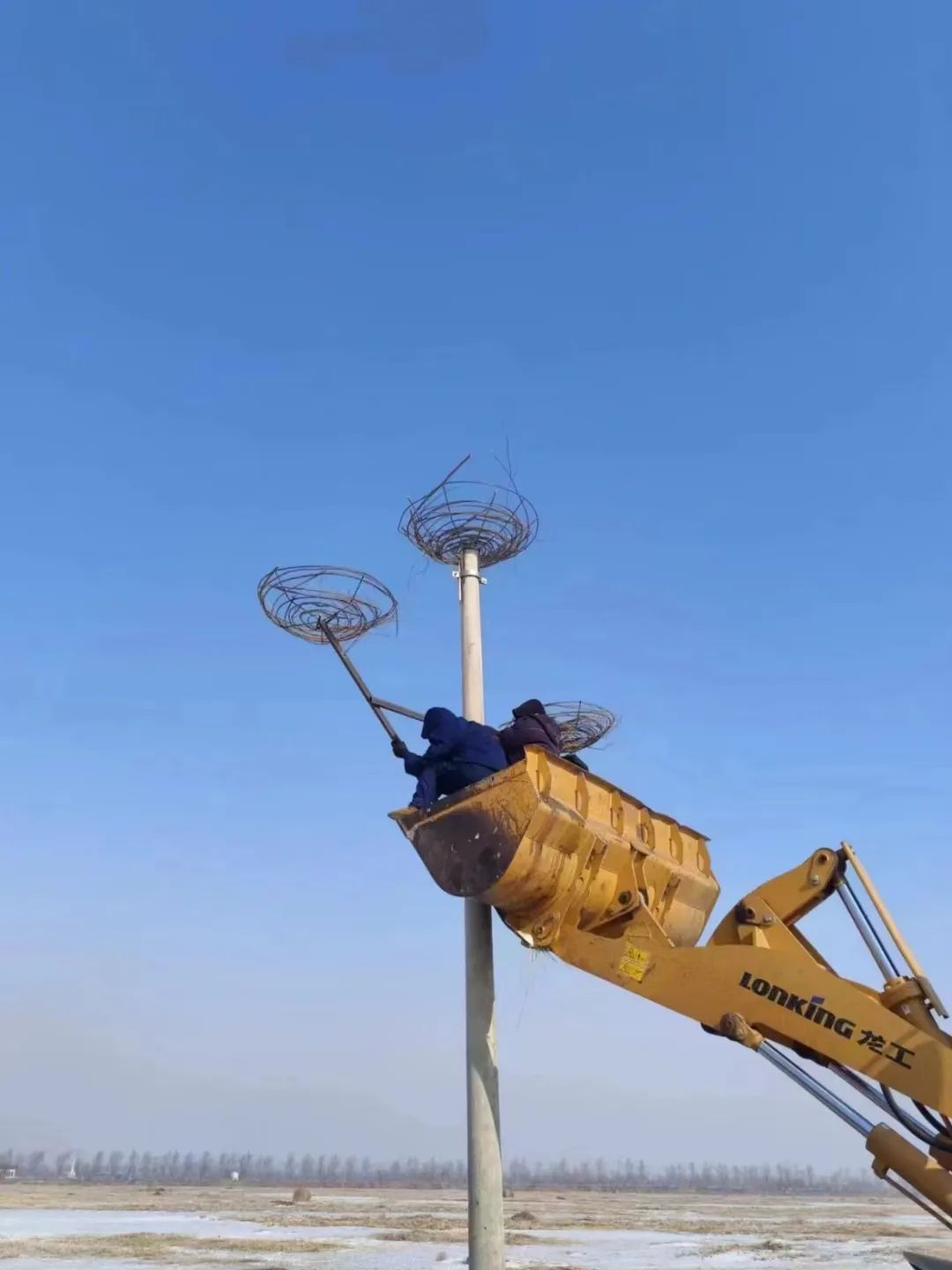 肇东市千鹤岛风景区东方白鹳人工鸟巢陆续架设搭建完成!