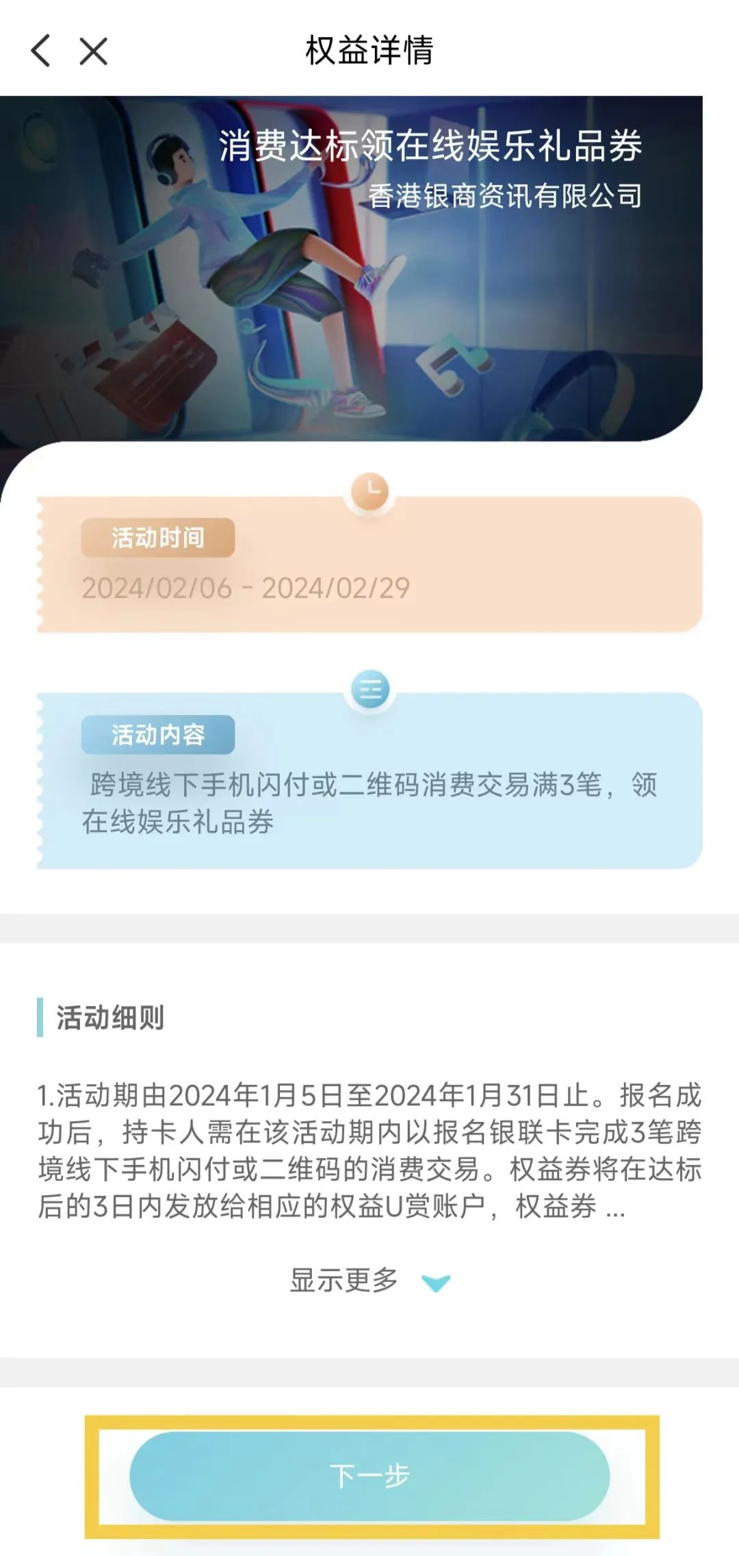﹡活动分为多个活动期,在单期活动内需持卡人报名参加(每期活动的开展时间、具体规则以权益U赏内活动报名页为准)。