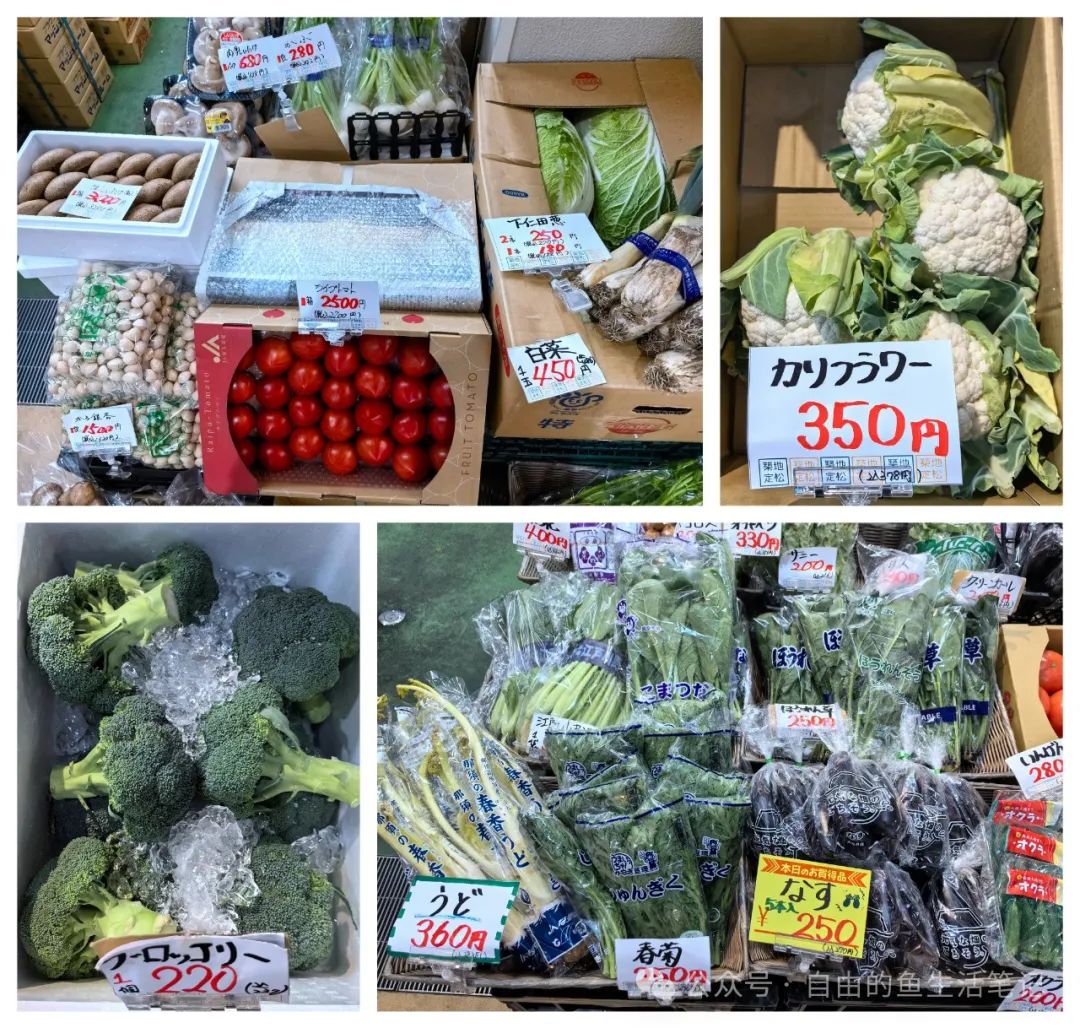 蔬菜,一个菜花350日元(约人民币17元),一个西兰花220日元(约人民币11元),一棵白菜450日元(约人民币22元),青菜茄子一包十几元人民币。