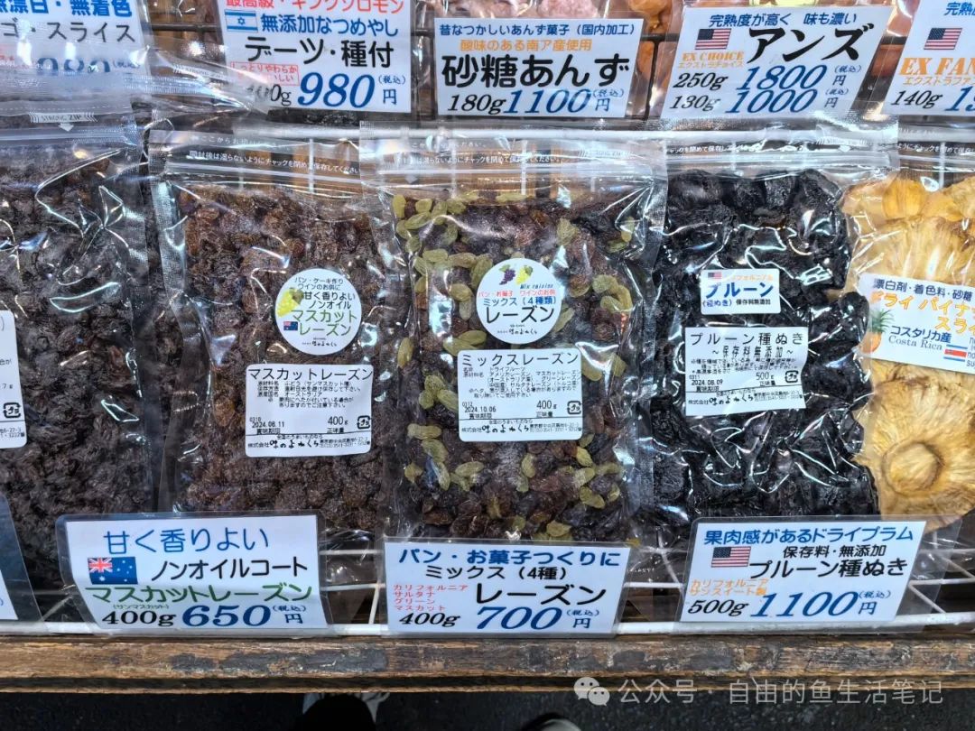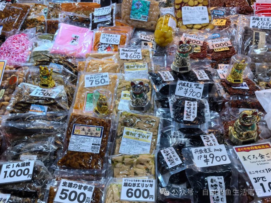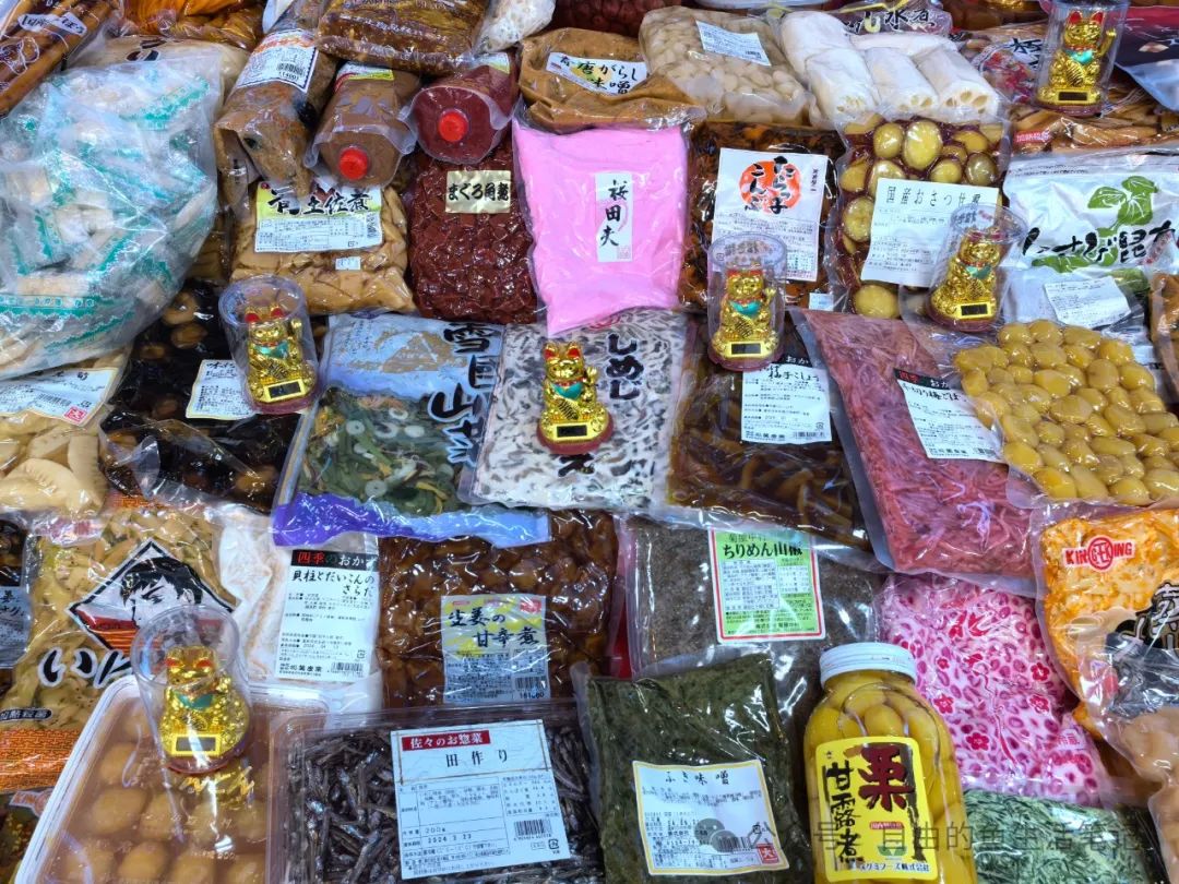 1袋400克普通品种的葡萄干,约人民币35元,这个价格和国内差不多。还是各种酱菜,每袋合人民币三、四十元,和国内的同类产品相比,是有些贵了。早上阴天,光线不好,照片拍得模糊,看到上面的招财猫了吗?