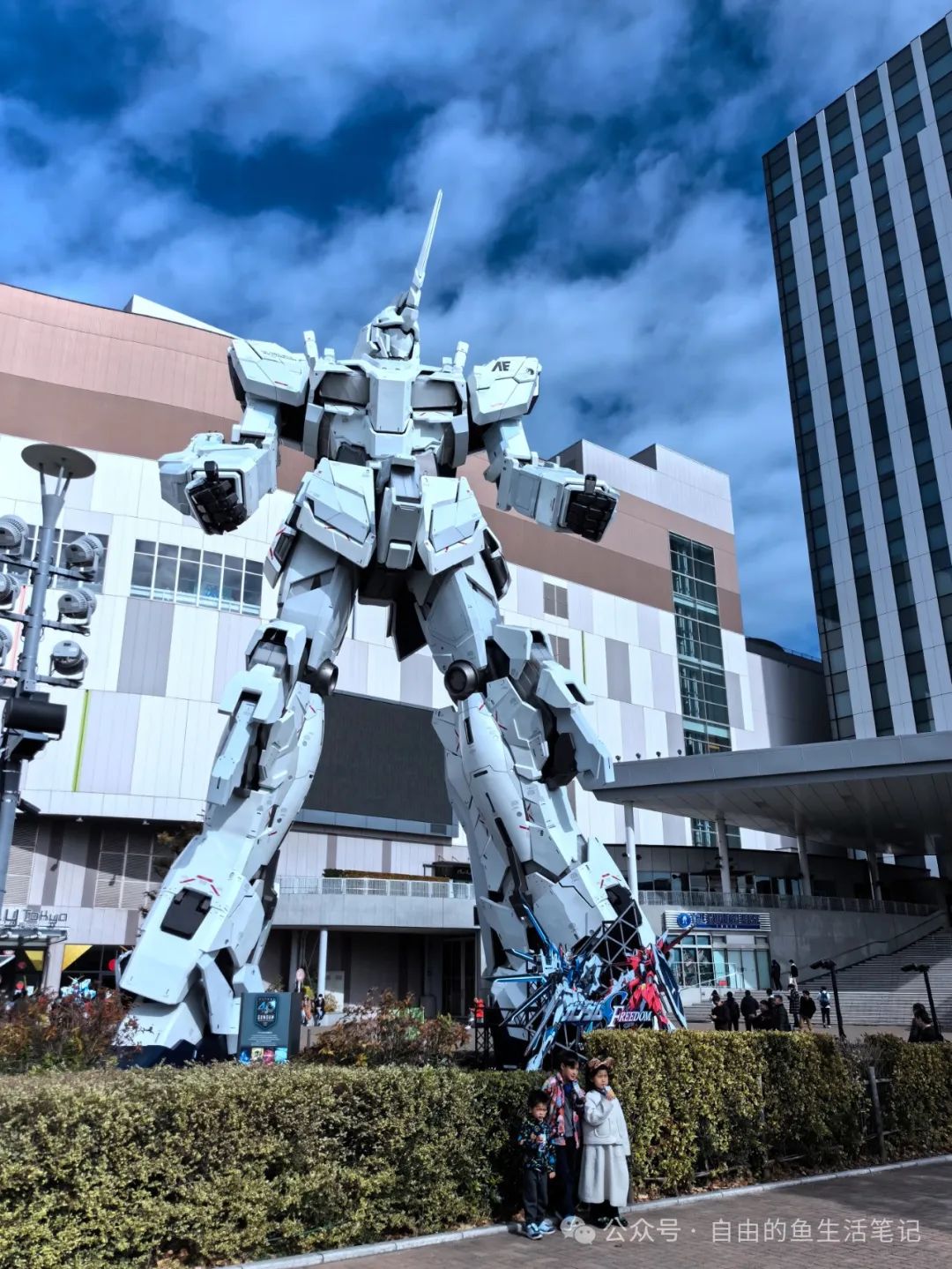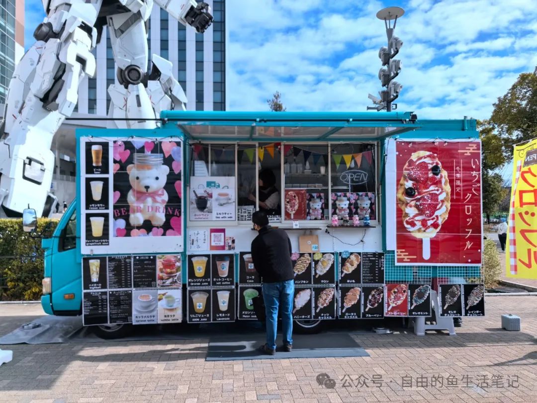 沿着商场、电视台前面的道路,周边都像是属于一个很大的公园,这里矗立着一个高达机器人战士,有几辆可爱的流动餐车,售卖各种食品饮料。