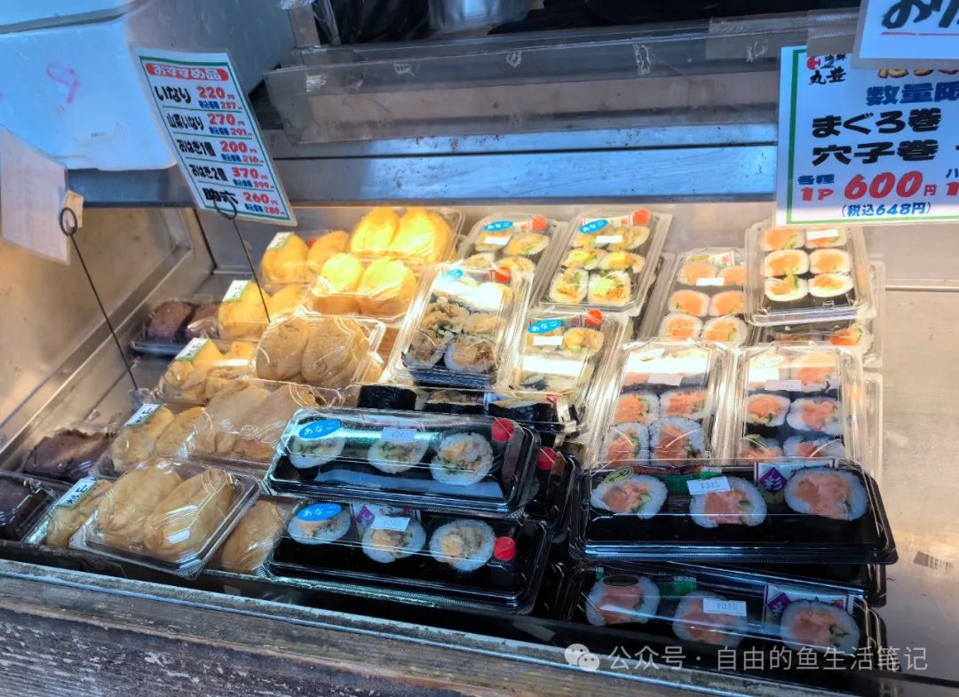 从市场出来,继续在街上闲逛,这一带有两条南北向的主路,主路之间是居民区,横着竖着有几条窄窄的小路穿插其中,路边开着不少小店,早上大多没开门或者刚准备营业,只有两家算是早餐店吧,门前排着长长的队伍,一家店主营玉子烧,另一家店主营寿司。寿司一盒3个装345日元(约人民币17元),6个装648日元(约人民币32元)。除了这两家店,再没有卖早餐、食物的店了,我不想排队,没有买。