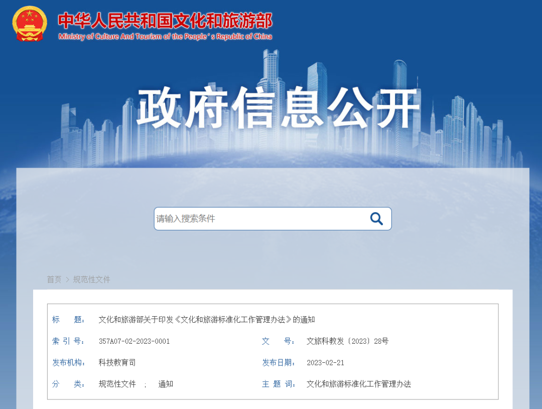 【主要内容】《管理办法》共五章二十八条,包括总则、机构与职责、标准的制定、实施和监督以及附则等内容。其中,第一章主要明确标准化工作目的、适用范围、工作原则;第二章重点厘清标准化归口司局、业务司局、全国专业标准化技术委员会管理办法等工作机构职责;第三、四章详细说明文化和旅游标准制定、实施和监督全过程的管理要求和程序。