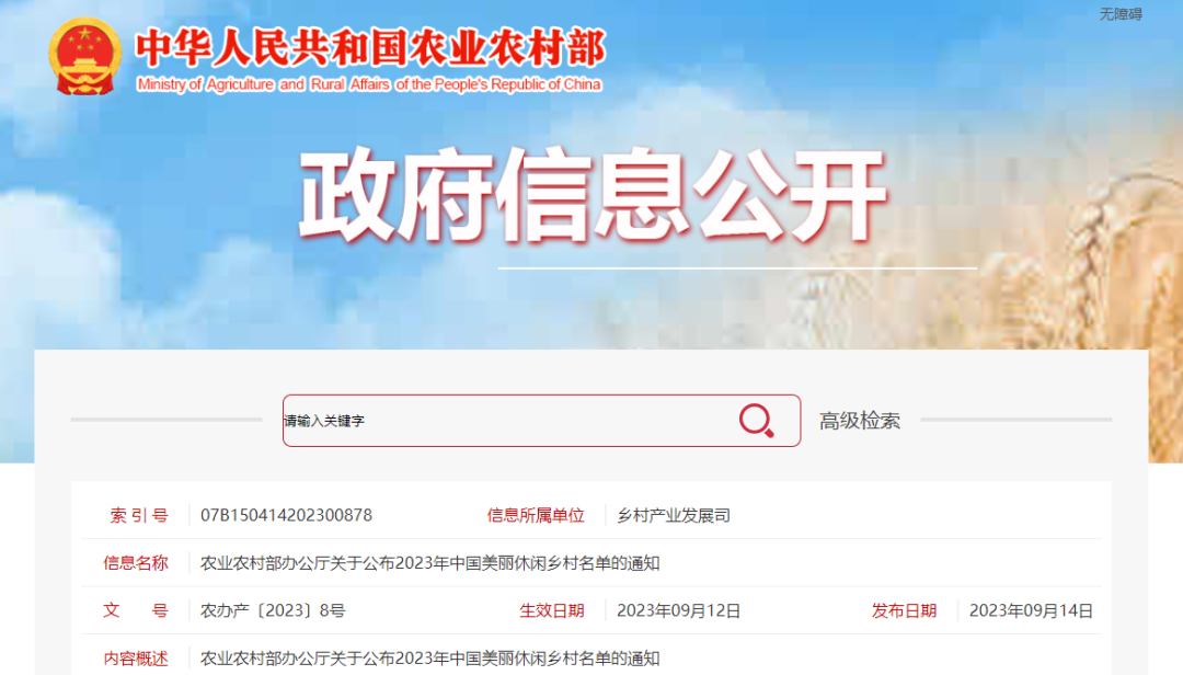 【主要内容】经各地推荐、专家评审和网上公示,推介北京市房山区张坊镇大峪沟村等256个村落为2023年中国美丽休闲乡村,其中北京市怀柔区怀北镇河防口村等79个乡村同时为农家乐特色村。
