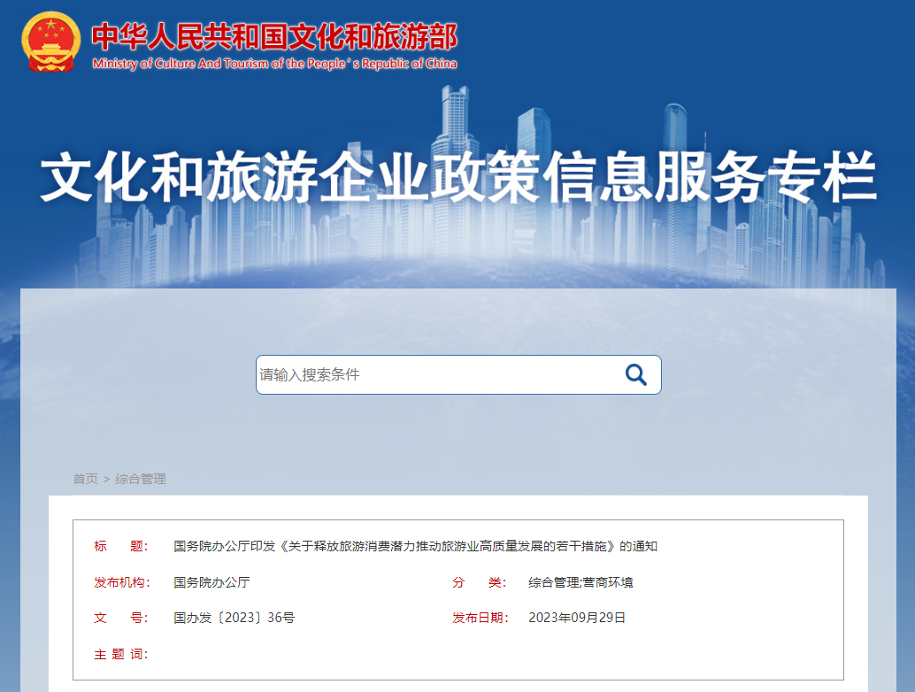 【主要内容】从加大优质旅游产品和服务供给、激发旅游消费需求、加强入境旅游工作、提升行业综合能力、保障措施等五个方面,提出了推动旅游业高质量发展的30条工作措施。推进文化和旅游深度融合发展,实施美好生活度假休闲工程,实施体育旅游精品示范工程,开展乡村旅游提质增效行动,发展生态旅游产品,拓展海洋旅游产品,优化旅游基础设施投入,盘活闲置旅游项目。