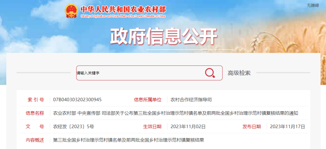 【主要内容】认定北京市大兴区庞各庄镇等100个乡(镇)为第三批全国乡村治理示范乡镇、北京市朝阳区高碑店乡高井村等1001个村为第三批全国乡村治理示范村。同时,组织各地农业农村、宣传、司法行政等部门对第一、二批全国乡村治理示范村镇开展复核,按照复核标准,决定撤销4个全国乡村治理示范乡镇和19个全国乡村治理示范村,注销2个全国乡村治理示范乡镇和6个全国乡村治理示范村。
