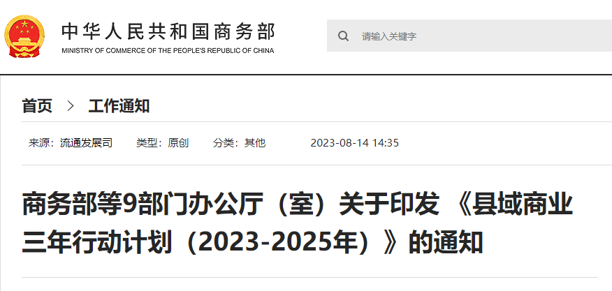 【主要内容】建立县域统筹,以县城为中心、乡镇为重点、村为基础的农村商业体系。到2025年,在全国打造500个左右的县域商业“领跑县”,建设改造一批县级物流配送中心、乡镇商贸中心(大中型超市、集贸市场)和农村新型便民商店。90%的县达到“基本型”及以上商业功能,具备条件的地区基本实现村村通快递。工业品下乡、农产品进城双向流通渠道进一步畅通,农民增收和消费提质实现良性循环,更好满足乡村产业振兴和农村居民生产生活需求。