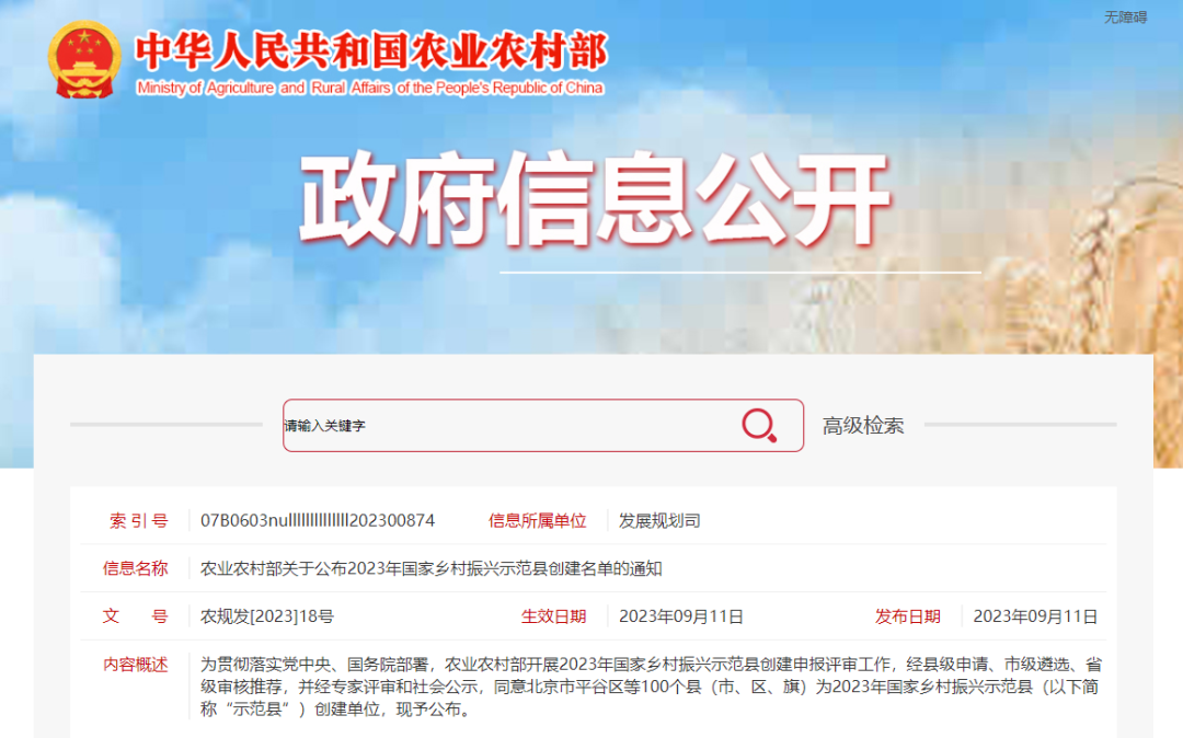 【主要内容】经县级申请、市级遴选、省级审核推荐,并经专家评审和社会公示,同意北京市平谷区等100个县(市、区、旗)为2023年国家乡村振兴示范县创建单位。