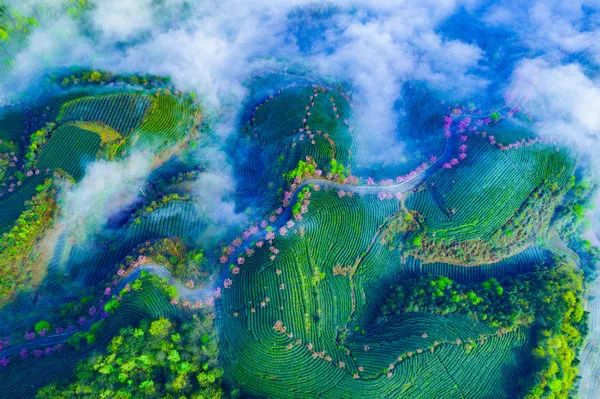 景区森林覆盖率85%以上,植被丰富、物种多样、树木苍翠。从高处俯瞰,茶园环绕,呈现出茶中有花、花中有茶的绝美风光。