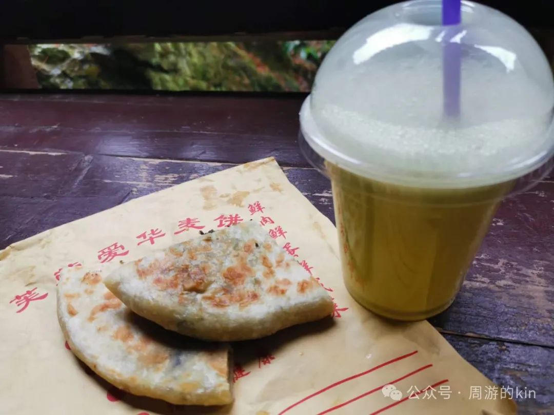 上图,麦饼+鲜榨石斛汁(景区内10+15元),算是登山好口粮。麦饼是这一带的特色食品,内放虾皮、葱花、肉丁、香干,掺上蛋作馅,擀成团扇大小状,烙熟,有软、脆2种,脆的似乎又称“麦塌镬”,很香。这一带又是石斛种植基地,第一次见用来鲜榨汁,可能因为是要兑开水榨,味淡如开水。