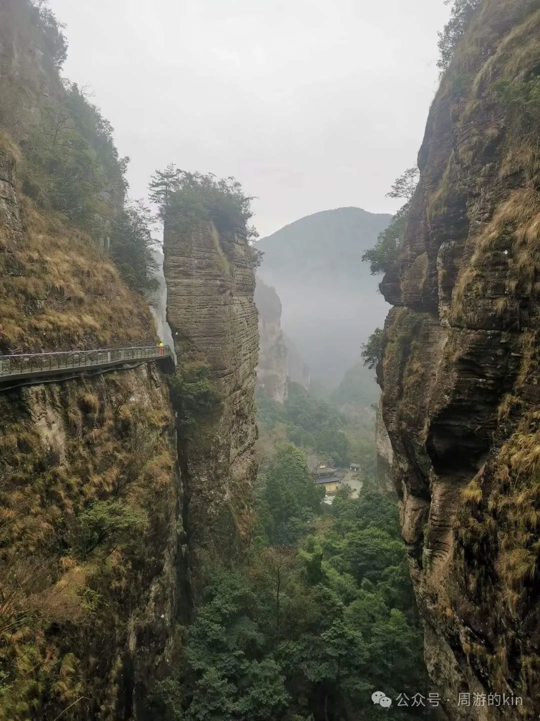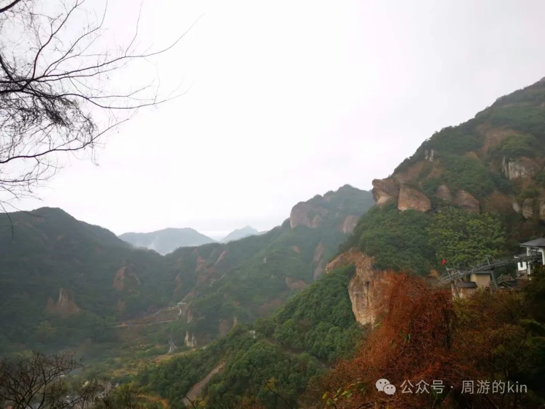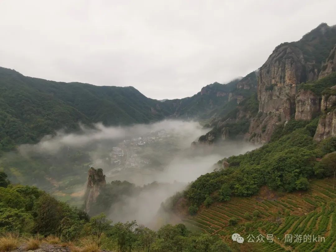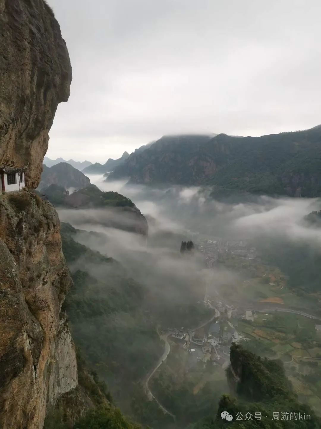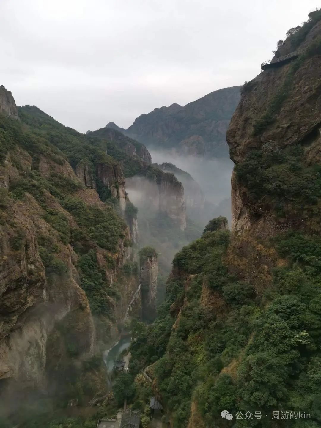 从方洞到灵岩,在山上走栈道过索桥,一路风景极佳,尤其是上午时雨时阴,云雾缭绕,山岩、村落时隐时现,缥缈空濛。应该讲此处是雁荡山的精华所在。(附tips:如自驾,建议将车停在灵岩停车场,灵岩景区出入口有区间车到方洞景区缆车入口,每人10元,坐缆车上山每人40元,再走栈道到灵岩景区,全程是下山路,相对好走,在灵岩出来取车,省时省力。记得买方洞和灵岩2个景区的联票。此外,在灵岩停车场有本地司机拉客,从灵岩停车场到方洞缆车的山上站点,每人30元。当然体力强想登山者、不差钱者不在此列)。