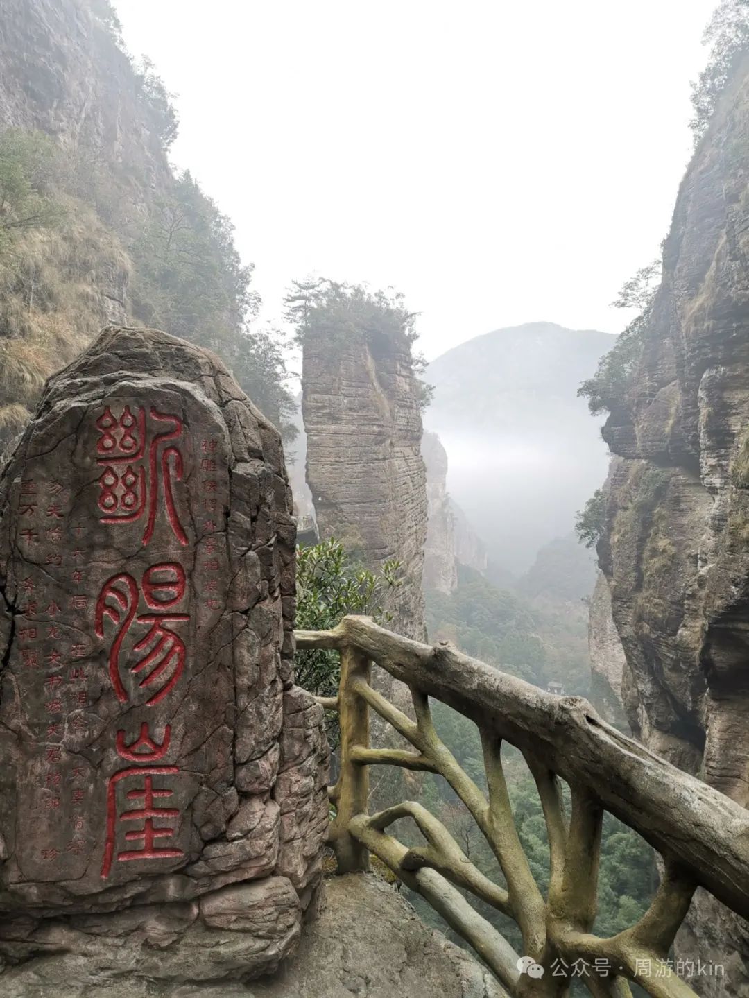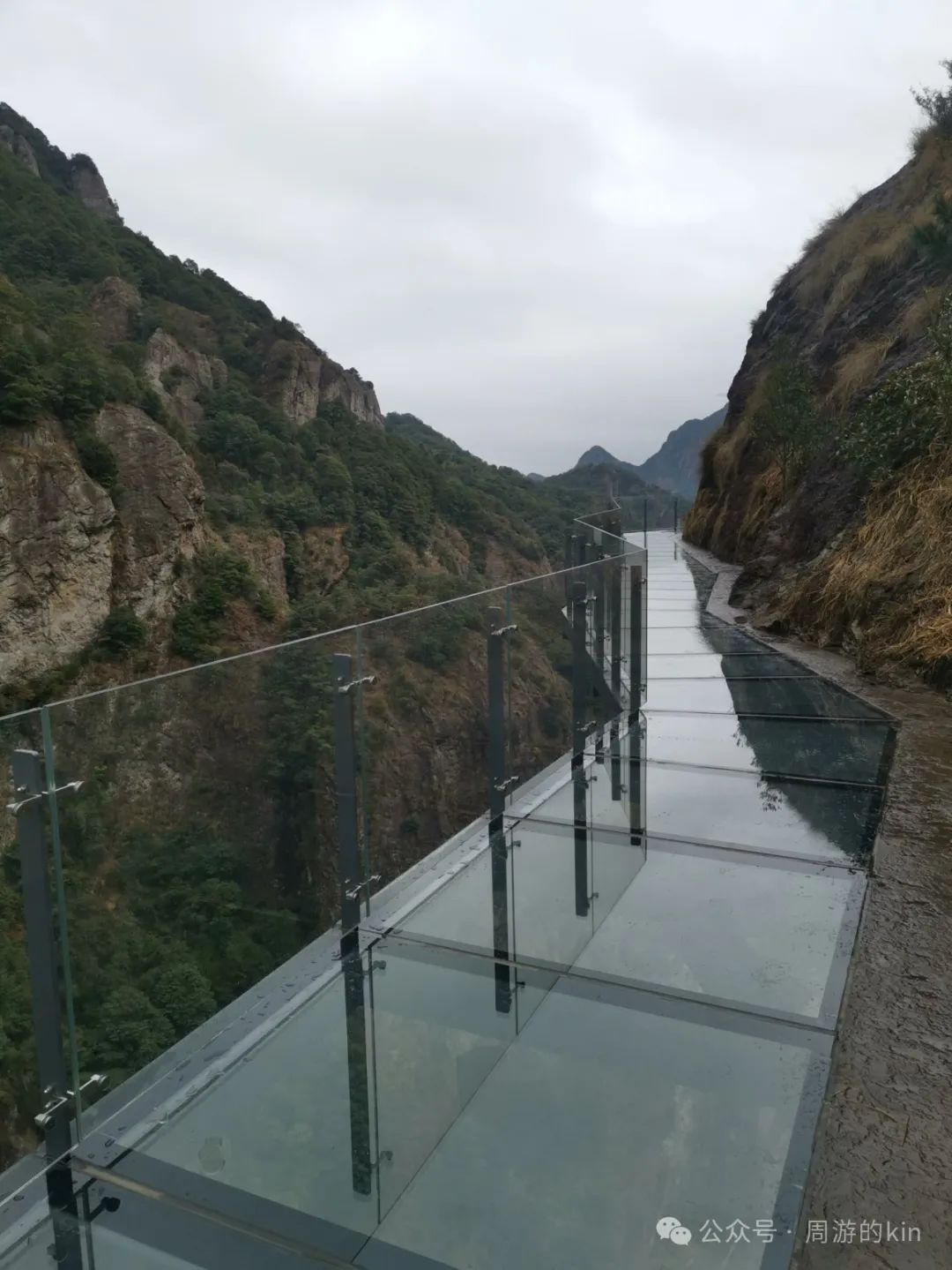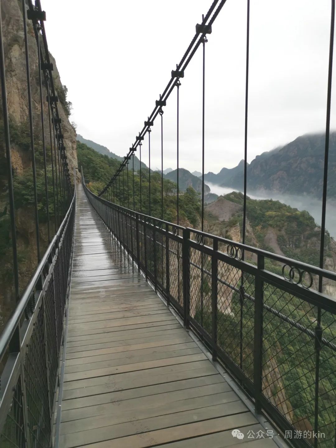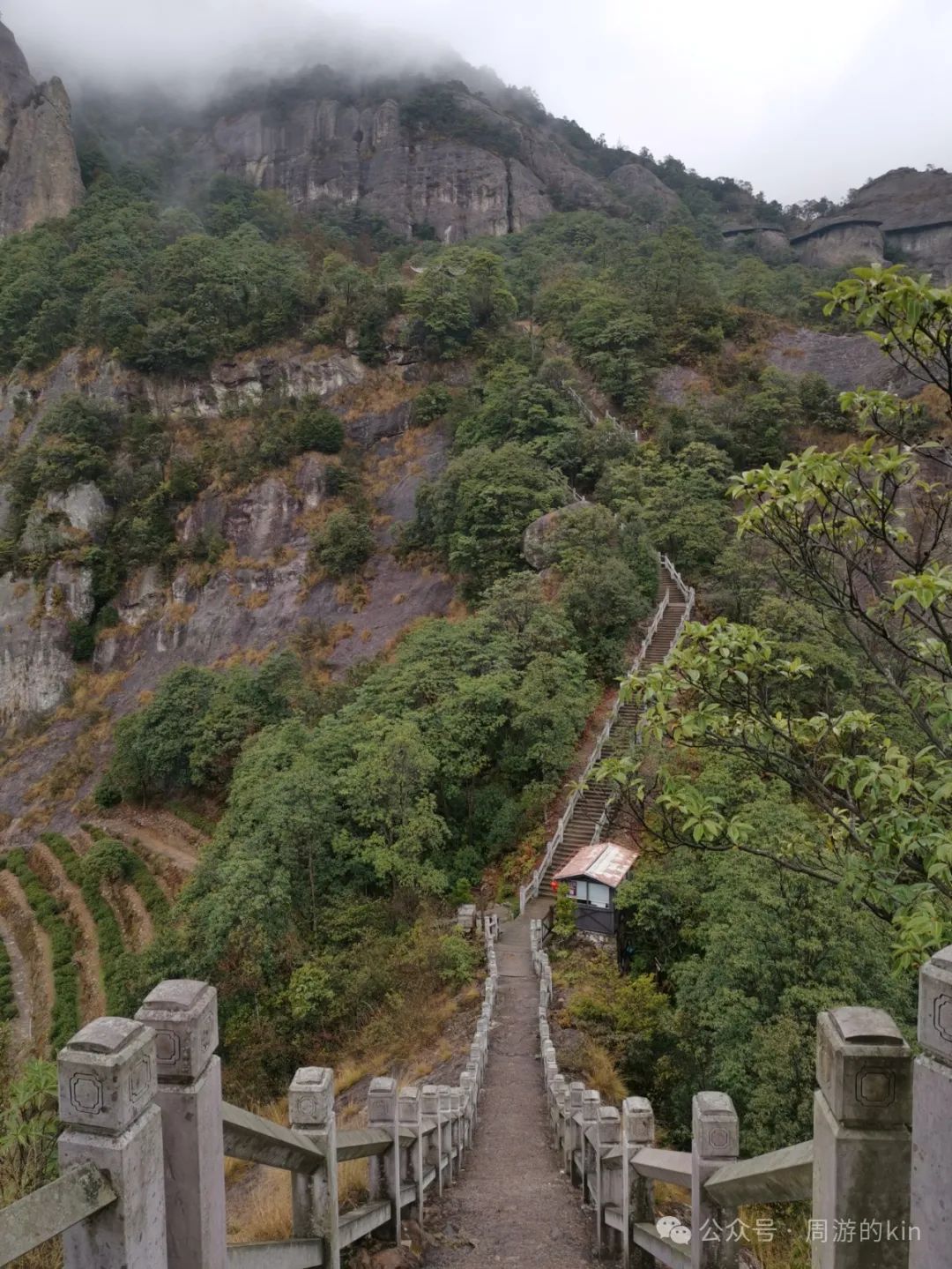 从方洞到灵岩,在山上走栈道过索桥,一路风景极佳,尤其是上午时雨时阴,云雾缭绕,山岩、村落时隐时现,缥缈空濛。应该讲此处是雁荡山的精华所在。(附tips:如自驾,建议将车停在灵岩停车场,灵岩景区出入口有区间车到方洞景区缆车入口,每人10元,坐缆车上山每人40元,再走栈道到灵岩景区,全程是下山路,相对好走,在灵岩出来取车,省时省力。记得买方洞和灵岩2个景区的联票。此外,在灵岩停车场有本地司机拉客,从灵岩停车场到方洞缆车的山上站点,每人30元。当然体力强想登山者、不差钱者不在此列)。