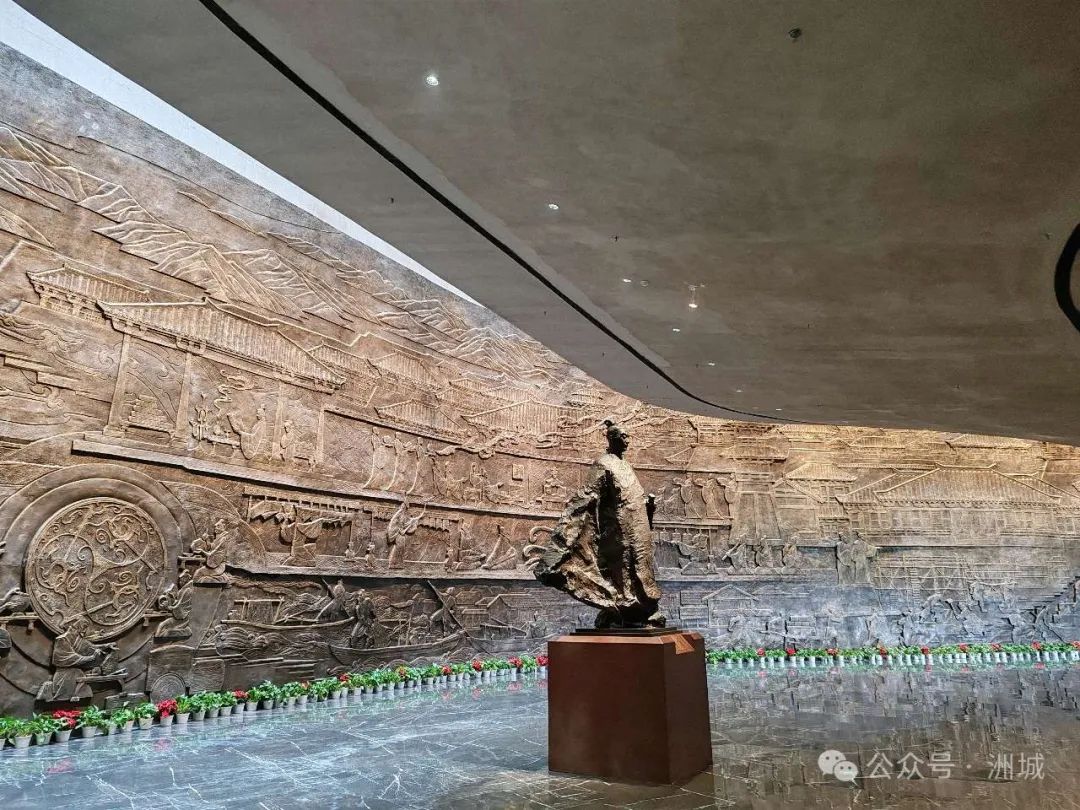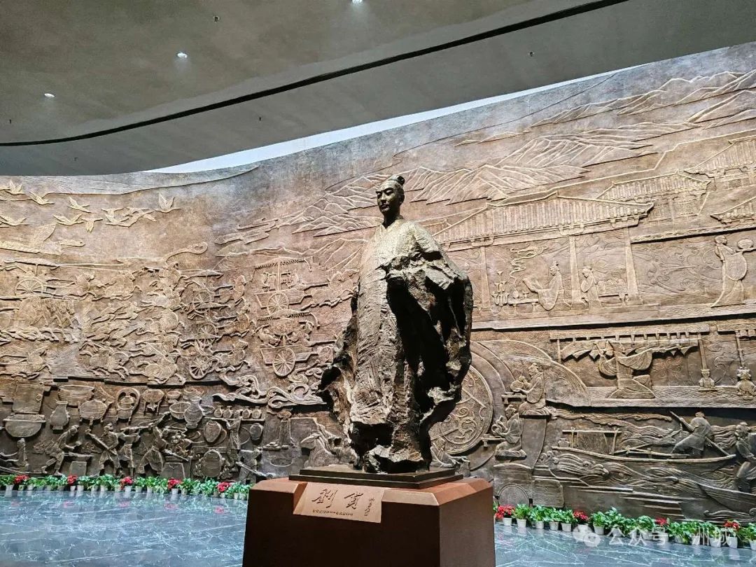 一会儿,来到海昏侯国遗址博物馆,进得大厅,就是刘贺十九岁时的铜像。远处是汉代长安的浮雕,把强汉气象稍微向我们展露出来。