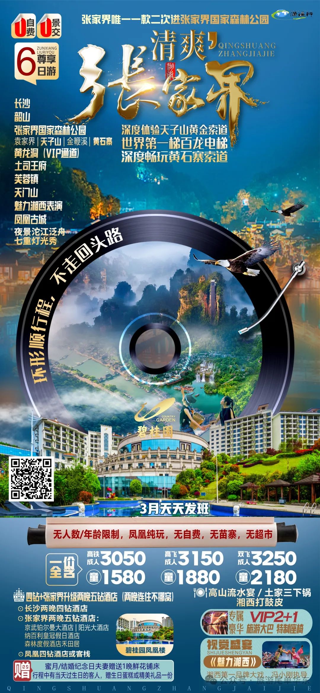 4大5A景区:张家界森林公园+天门山玻璃栈道+韶山+凤凰古城