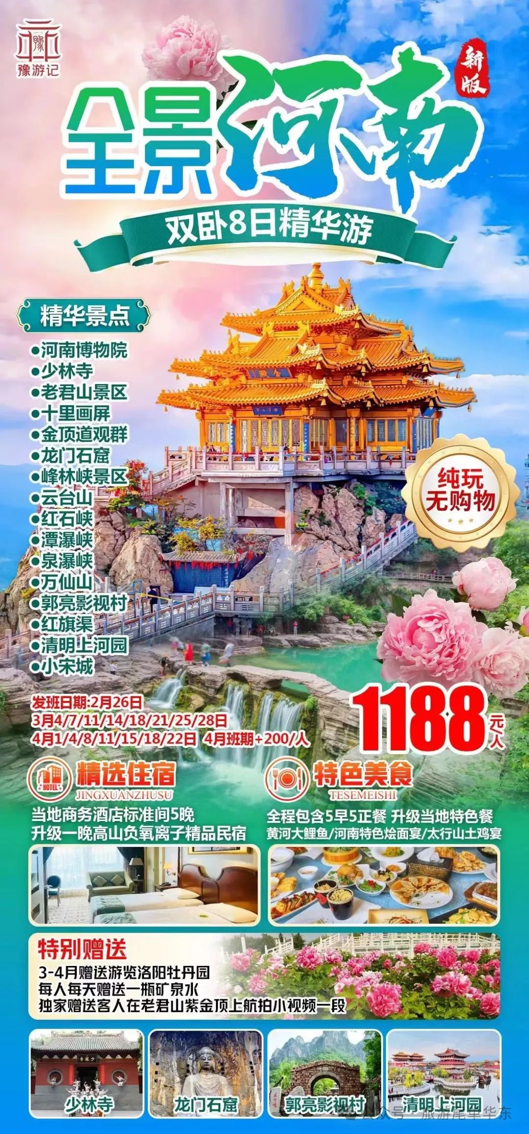 老君山、少林寺、龙门石窟、清明上河园、挂壁公路、郭亮村、云台山、红石峡、红旗渠、峰林峡,翡翠湖,等精华景点!