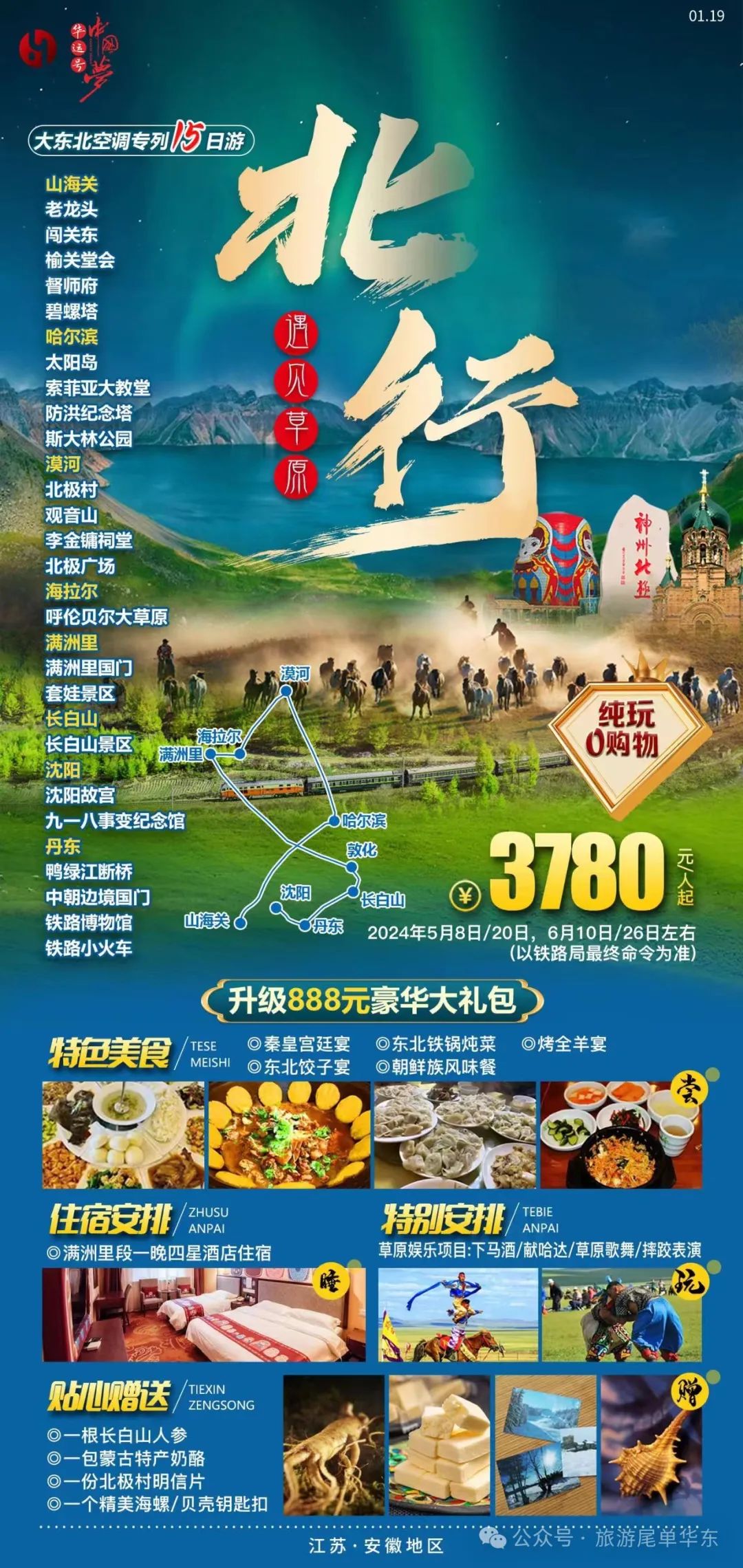 山海关、北戴河/葫芦岛、哈尔滨、漠河、北极村、海拉尔、满洲里、呼伦贝尔大草原、长白山、沈阳、丹东 15日空调旅游专列,5-6月连续发班