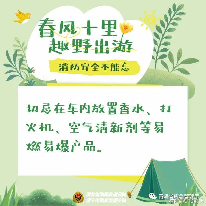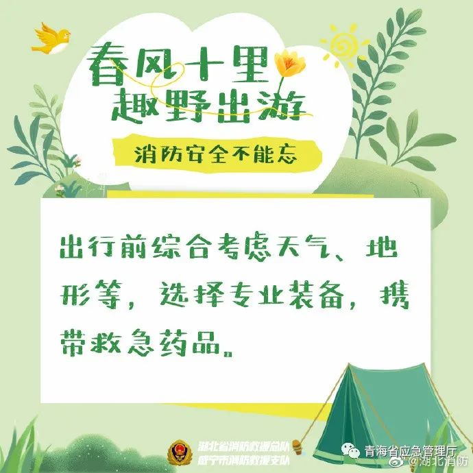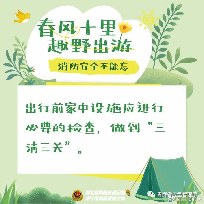 春暖花开时节,很多人会选择外出郊游、野炊、登山等活动。春季出游勿忘消防安全,要注意郊游时不带火源进树林,野炊时要选择远离易燃物的空旷地点……还有哪些消防注意事项?