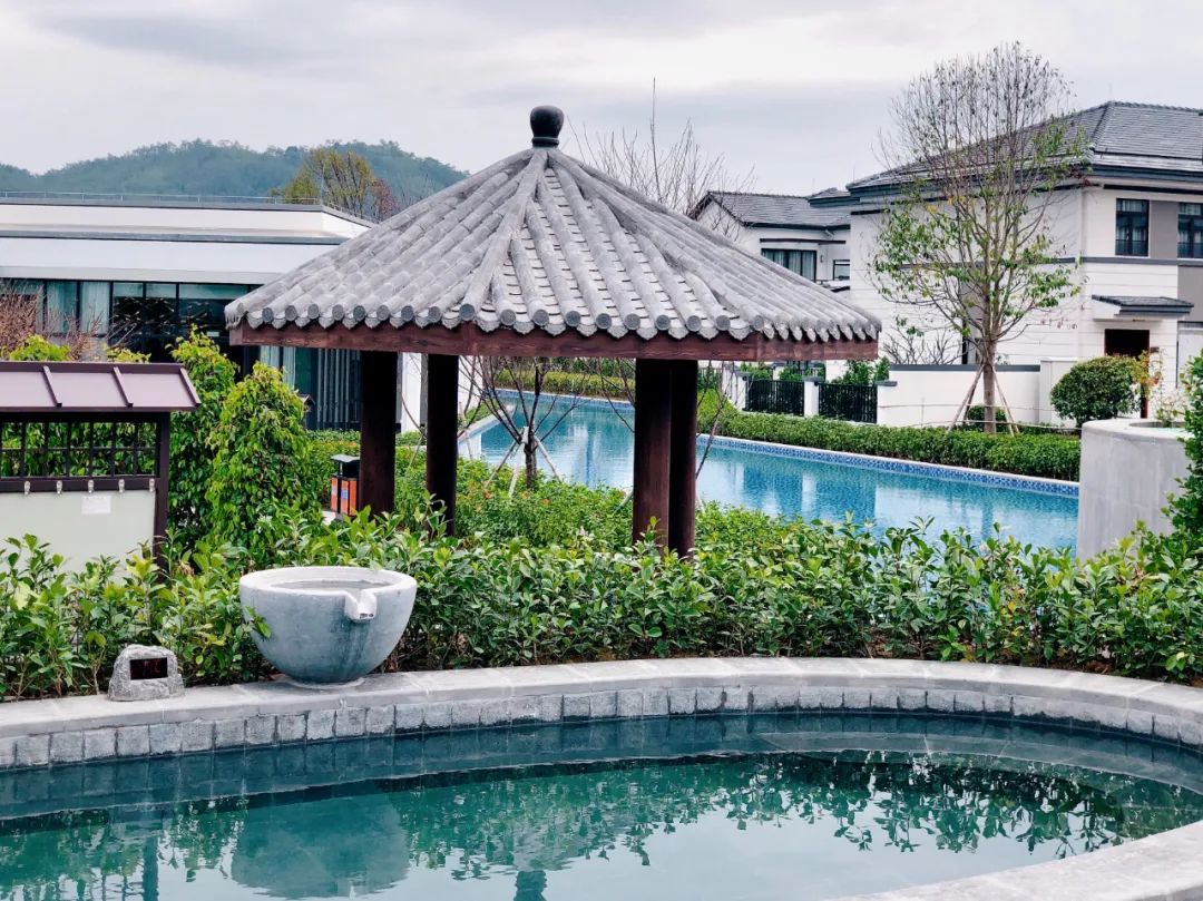 园区的各种泡池分布均匀,四周绿植环绕,空气干净清新,设有特色主题区、中华文化区、徽派印象区、琴瑟和鸣区四个区域。