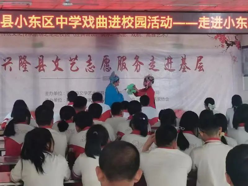 兴隆县文化馆组织我县书法家协会、美术家协会、戏剧家协会的优秀艺术家代表,以及我县非遗传承人,组成文艺志愿服务队,走进中小学,开展了包括传统戏剧、红歌、书画、经典诵读的高雅艺术进校园活动。艺术家们与师生互动,深受广大师生好评。