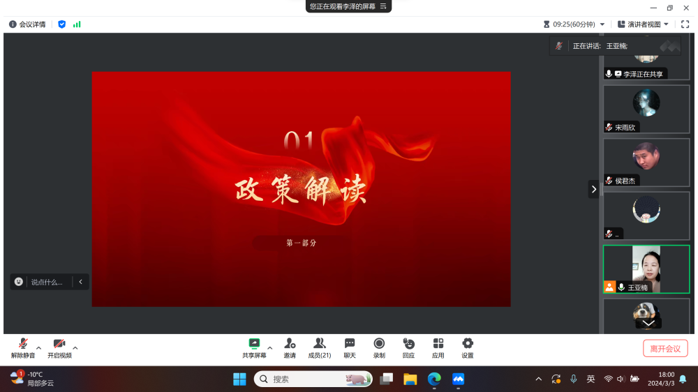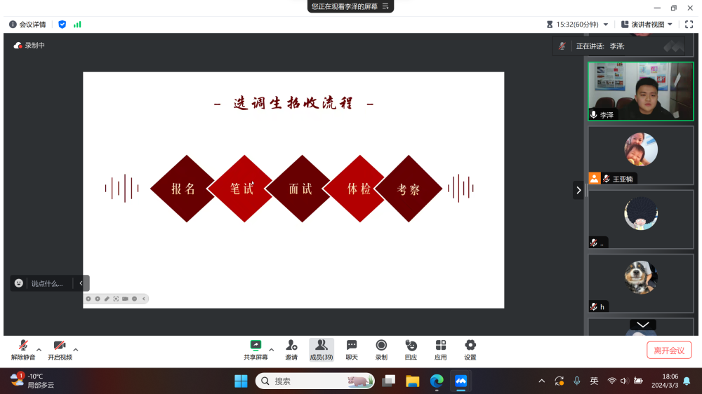 李泽学长首先从政策解读出发,介绍了选调生的定义与基本情况,并详细描述了招生流程,对报名、笔试、面试、体检以及考察这一系列环节分别进行拆分讲解,使同学们进一步具体了解选调生的方方面面。随后,李泽学长分享了自己对于考取选调生的计划和就业相关的见解,他用自己的亲身经验表明考试前要制定一份目标明确、切实可行的学习计划。同时李泽学长不仅向大家展示了选调生的优势,还细心提醒大家在考试前要调整心态、作息并提前好所用材料和饮食住宿的问题。同学们听了讲解后纷纷提出自己的疑问,李泽学长和辅导员王亚楠老师就选调生政策及具体情况进行现场答疑解惑,共同进行了热闹的探讨与交流。