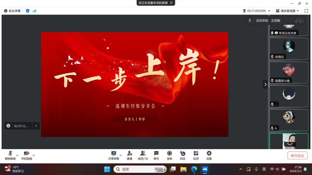 基层是磨砺政治素养和培育新思想的大熔炉,在“请党放心,强国有我”的使命引领下,一批又一批的文旅优秀学子奔赴基层,成为选调生,在平凡的岗位上,扎根一线,攻坚克难,锐意创新,建功立业,在新时代的洪流中砥砺前行。为了帮助同学们深入了解最新的选调生形势和要求,明晰职业规划和发展方向,文化旅游学院于2024年3月3日18:00在线上举办了以“选调生”为主题的“文旅”面对面交流活动。本次活动邀请了我院2023届旅游管理专业的优秀毕业生李泽学长,为同学们详细介绍了选调生并分享其工作经验。辅导员王亚楠老师主持本次会议。