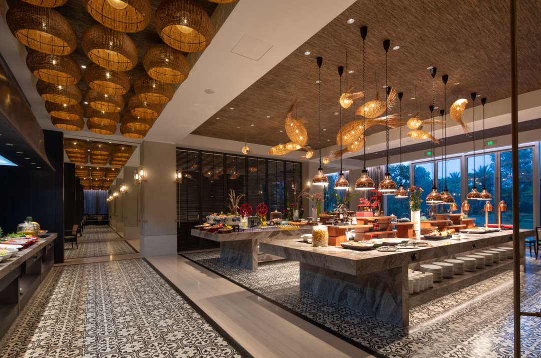 酒店的银海全日餐厅有体现疍家元素与海洋风格的花纹地砖、竹编鱼灯。这里可以提供一日三餐,特别是海边的肥美海鲜,生蚝、大虾、贝类、蟹类……