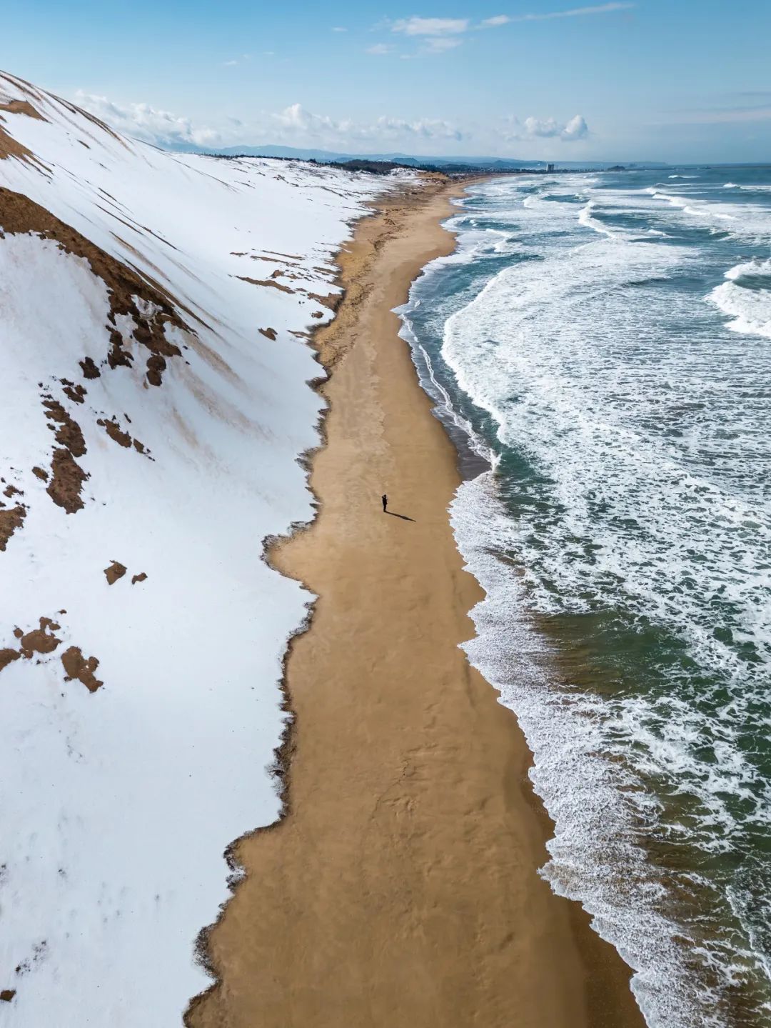点评:冰雪和海浪之间的砂丘,看上去宛如大自然中一条雄伟而笔直的道路。构图非常棒,乍看上去并不像鸟取砂丘。