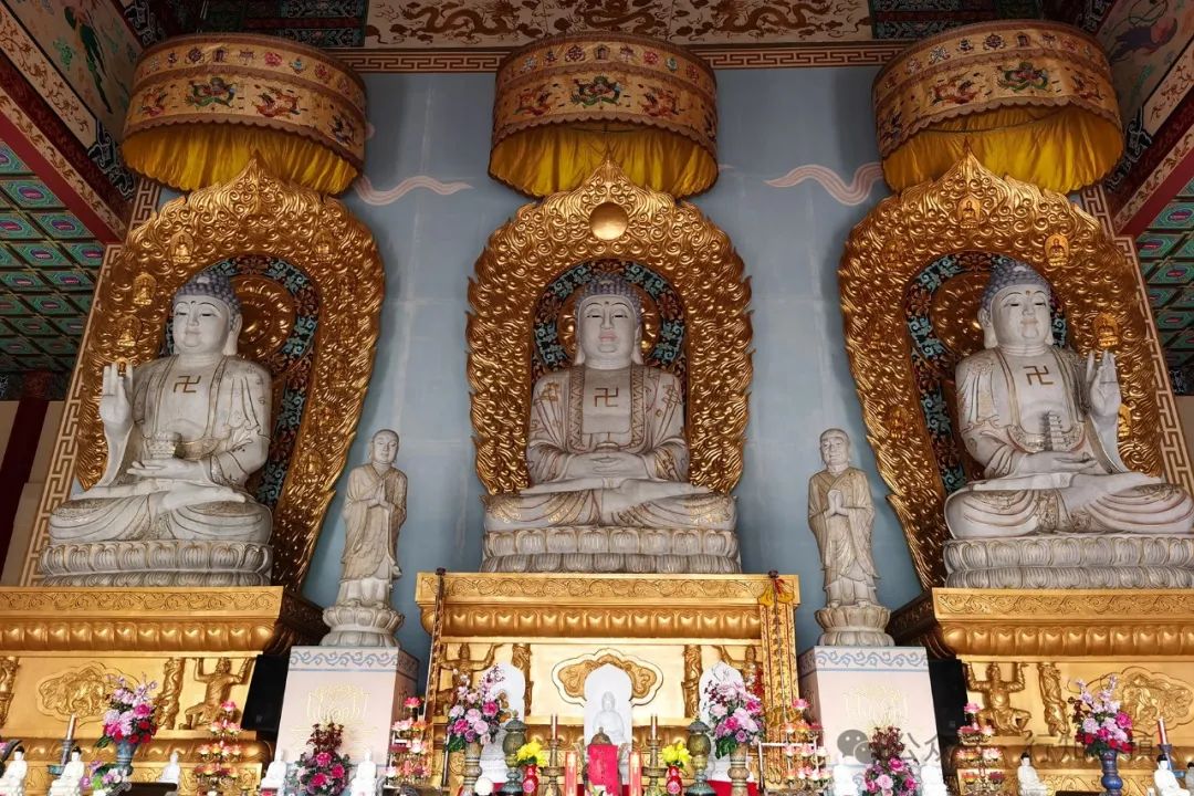 寺庙于2008年建成,占地80多亩,建筑面积约9200平方米,仿宋“伽蓝七殿”风格,主要建筑有大雄宝殿,天王殿、观音殿、文殊殿、普贤殿、地藏殿、藏经阁、方丈室和禅堂等,其中最具特色的是殿内的佛像采用了大量缅甸白玉为材料,也因此获得多项“大世界基尼斯”的荣誉称号。这也是很商业化的一座寺庙,除了出售多种贡品,还开设有餐饮茶座和书店等设施,寺后有海岸沙滩椰树,适合玩耍拍照,天气晴好的话也是一个好去处。