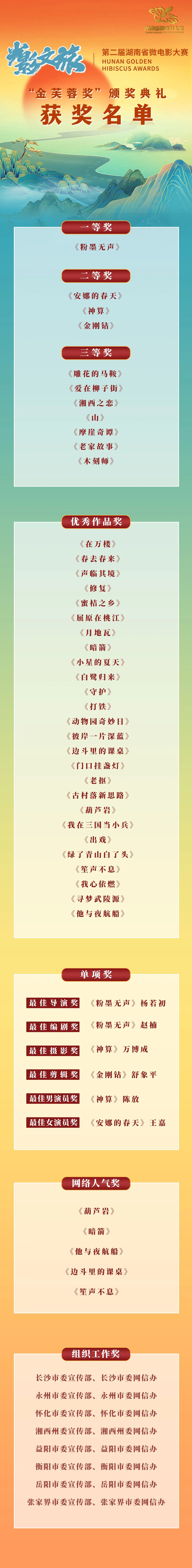 您现在的位置是:首页 > 国内旅游目的推荐 > 正文 国内旅游目的推荐 “光影文旅”第二届湖南省微电影大赛“金芙蓉奖”颁奖典礼举行 admin2024年03月08日 22:36:26国内旅游目的推荐103 3月8日,“光影文旅”第二届湖南省微电影大赛“金芙蓉奖”颁奖典礼在湖南广播电视台节目生产基地“七彩盒子”举行。省委宣传部副部长、省电影局局长任晓山,省文联党组书记、主席夏义生等领导出席并为获奖作品颁奖。本次大赛由中共湖南省委宣传部、中共湖南省委网信办、湖南省电影局联合主办,潇湘电影集团、湖南省微电影微视频艺术协会承办,旨在学习贯彻习近平新时代中国特色社会主义思想和党的二十大精神,深入学习践行习近平文化思想,坚持以文塑旅、以旅彰文,用微电影的形式展现湖南在推进文旅发展的新作为、新担当、新气象,推动湖南文化和旅游深度融合、高质量发展。光影筑就梦想,“金芙蓉奖”重磅揭晓典礼现场,最佳男演员奖、最佳女演员奖、最佳摄影奖、最佳剪辑奖、最佳导演奖、最佳编剧奖、网络人气奖、优秀作品奖、一、二、三等奖及组织工作奖等12大奖项重磅揭晓,获奖代表依次上台接受荣誉表彰。金灿灿的奖杯与奖牌,铭记着每一位优秀创作者的辛勤付出和艺术成就,也见证了每一位微电影爱好者的电影梦想。其中,《粉墨无声》获“金芙蓉奖”一等奖;《安娜的春天》《神算》《金刚钻》等3部作品获“金芙蓉奖”二等奖;《雕花的马鞍》《爱在柳子街》《湘西之恋》《山》《摩崖奇谭》《老家故事》《木刻师》等7部作品获“金芙蓉奖”三等奖。杨若初(《粉墨无声》)、赵楠(《粉墨无声》)、万博成(《神算》)、舒象平(《金刚钻》)、陈放(《神算》)、王嘉(《安娜的春天》)等6位电影人分别获得最佳导演奖、最佳编剧奖、最佳摄影奖、最佳剪辑奖、最佳男演员奖和最佳女演员奖等6大单项奖。(附“光影湘村”湖南省微电影大赛“金芙蓉奖”完整获奖名单)光影照亮梦想,微电影创作硕果累累本届大赛共历时7个月,大赛组委会凝聚各级组织合力,层层发动,广泛宣传,成功吸引了上千名微电影爱好者踊跃参与,积极创作,全省电影创作热情高涨,电影文化氛围浓厚。大赛共征集到微电影作品395部,经过大赛组委会初评、专家评审、网络投票等多轮严格评选,最终38部主旨鲜明、立意深刻、题材丰富多样的优秀作品脱颖而出。这些作品均围绕湖南文旅发展互融互兴主题开展创作,或展现湖南非遗、民间艺术,引发观众对于中华民族传统文化保护与传承问题的思考;或溯源湖湘千年文脉,还原历史文化人物故事,展现古代潇湘文化胜景;或聚焦湖南各地的红色名片、风土人情、美丽风光、文旅地标产品;或反映文旅融合给三湘四水带来巨大变化,将镜头对准为文旅产业发展背后的各类群体,展现人性真善美。在电影事业蓬勃发展的今天,在文旅融合全面推进的新时代,湖南电影人深入生活、扎根人民,坚持以习近平新时代中国特色社会主义思想为指导,用微电影艺术诠释了“三湘四水,相约湖南”的精神内涵与时代价值,更彰显出了三湘大地蓬勃向上的光影新气象。来源:893湖南音乐之声二审:添乐三审:钟婧 转载请说明来源于"旅荐网",部分内容转载自网络,如有侵权请联系qlwl@foxmail.com删除 本文地址:https://www.15386.cn/post/19024.html 上一篇 【家得福】踏青出游季,吃烧烤,寻春色! 下一篇 吹响春日冲锋号!淄博再现出游热潮,妇女节登高踏青上春山! 相关文章 户外出行攻略,小众景点,避开人流 来乌镇,这份自由行攻略请收好! 第三届大学生体育旅游线路设计大赛通知|转自上体经管 五台山景区攻略仅供参考 首次出国旅游推荐哪个国家呢? 清明踏青正当时:三天小长假周旅游攻略 安徽池州旅游必去十大景点游玩攻略,2026年4月安徽这座被低估的诗意小城,这10个接地气景点和5道神仙美食,推荐收藏游玩 重庆广阳岛旅游攻略(2026最新) 湖南自驾宝藏路线!14个市州吃喝玩乐全攻略 大连环城旅游巴士上线啦!票价+线路站点→ 发表评论 取消回复 评论列表 这篇文章还没有收到评论,赶紧来抢沙发吧~