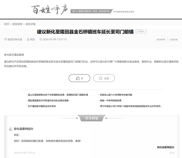 网友:建议新化至隆回县金石桥镇班车延长至司门前镇