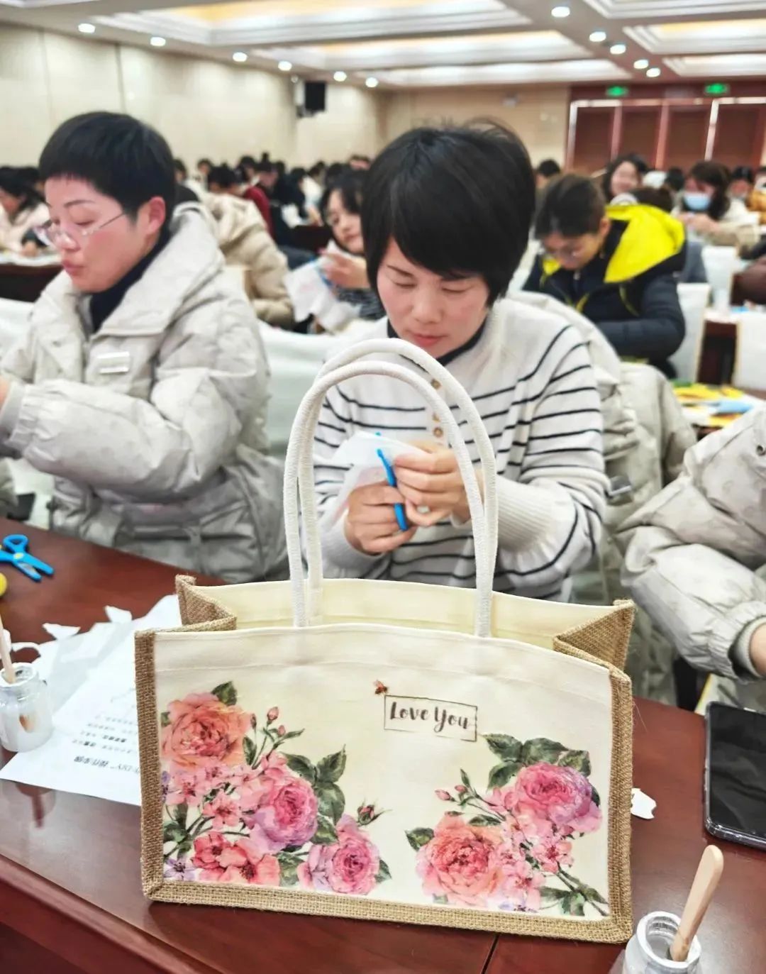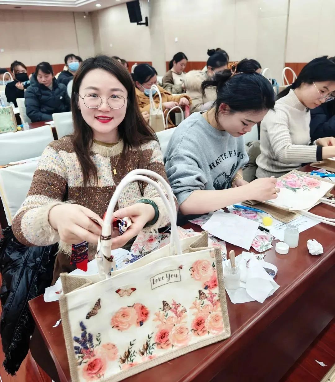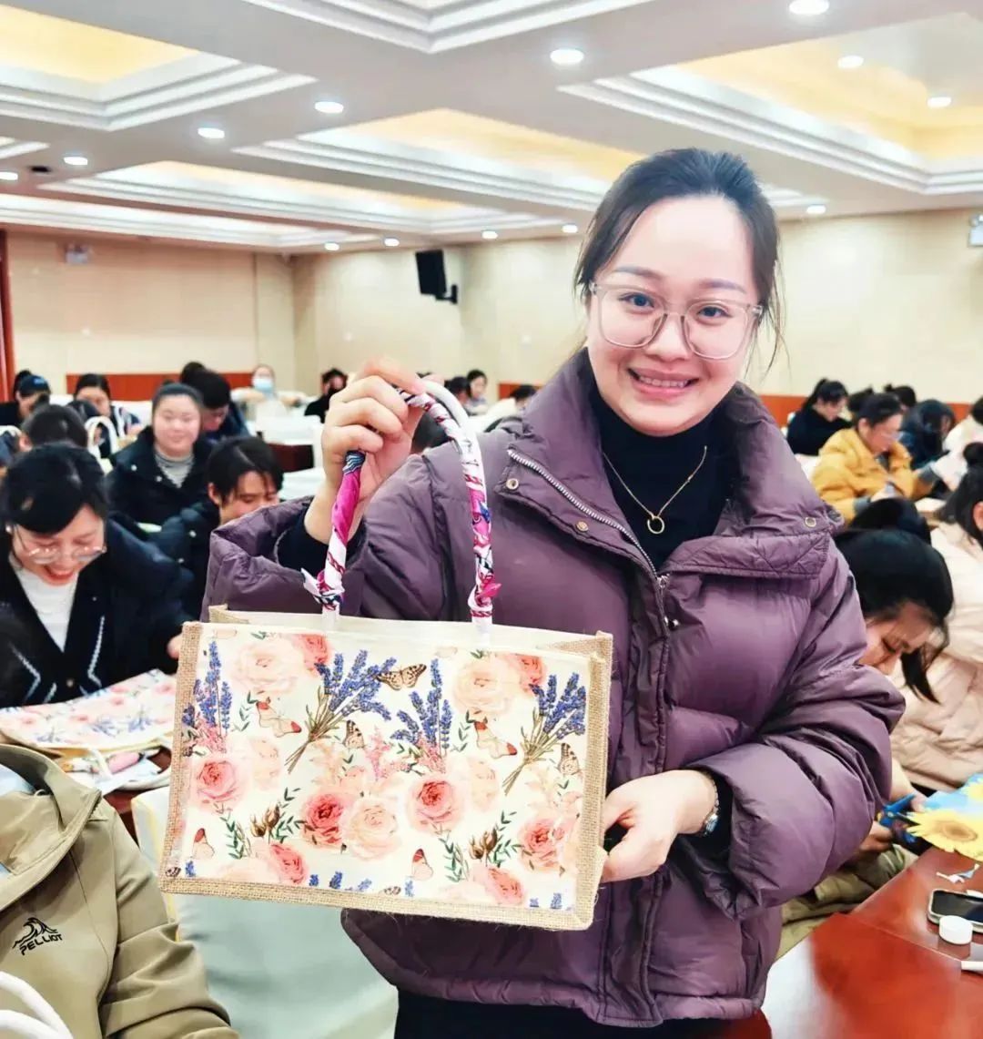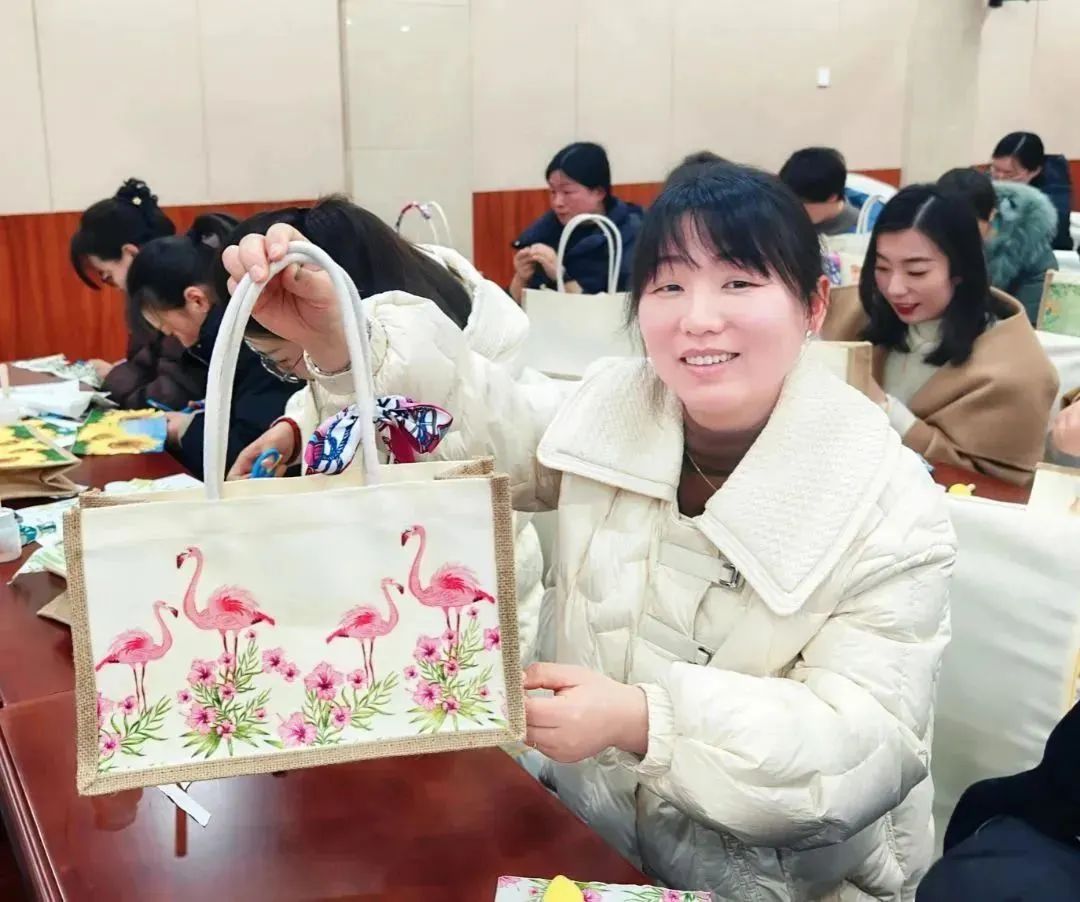 经过一下午“沉浸式”创作,一件件“素颜”的手提袋华丽变身为精美别致的艺术品。现场气氛轻松愉悦、欢乐温馨。