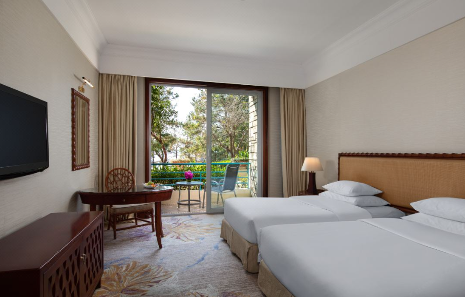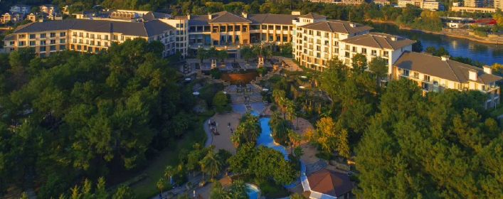 √ 度假村约300多亩,三面环水,自带森林,建筑坐落在半山腰上,近看园林湖景、远眺山峦小镇风光,可谓是“美景四重奏”!