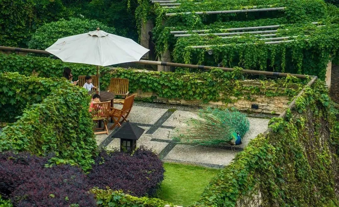 度假村共有孔雀约30-40只,除早晚在孔雀房喂食时能集中看到,其他时间,孔雀自由游走,行踪不定~~