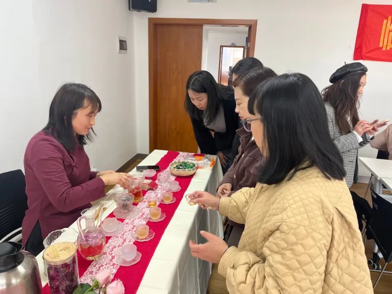 联合工会女职工代表玫瑰里民宿主现场展示“玫瑰花茶”系列茶席、品茶活动。各位女主人、管家、阿姨们,在讨论交流民宿管理经验,操作经验等,谈笑间,愉快的度过了“女神节”。