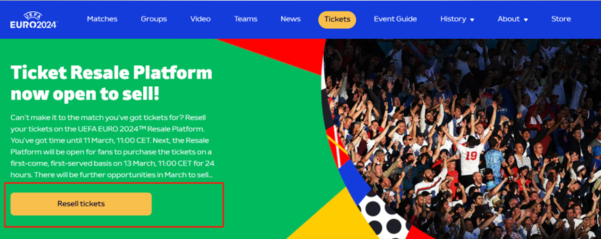 UEFA EURO 2024™ 转售平台是欧足联的官方频道,保证让球迷能够安全且按票价原价转售门票;还能确保球迷安全地从其他人那里购买门票。