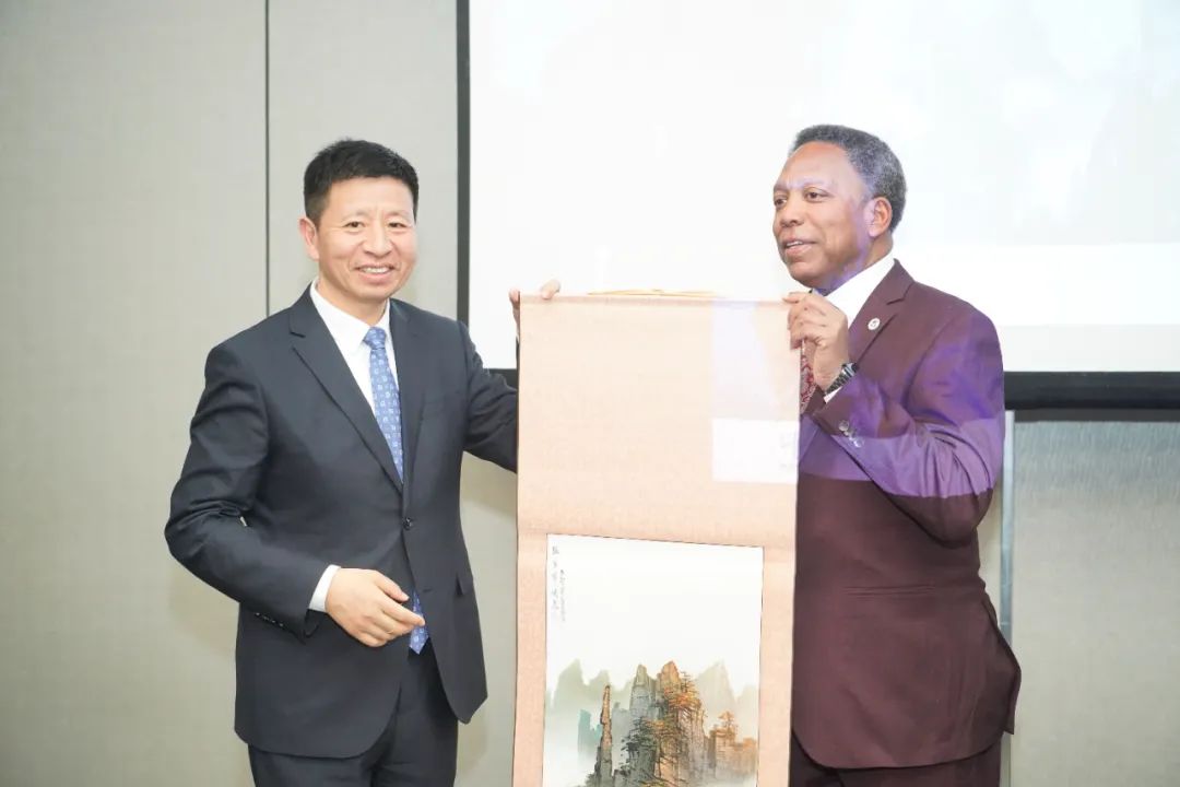 张家界市长王洪斌与新泽西林登市市长阿姆斯特德互赠纪念品。黄屏总领事也高度评价了张家界,将其誉为中国现代化进程中人与自然和谐共生的人间仙境。他详细介绍了张家界从一片默默无闻的深山区域,通过中国改革开放的浪潮,快速成长为全球知名的旅游胜地——全市森林覆盖率达71%,拥有世界级、国家级保护地12处,境内动植物种类是整个欧洲的1.5倍,是中国重要的生态屏障。如今的张家界,不仅是城市经济发展的强劲引擎,还是推动文化、健康、休闲和娱乐融合的现代文旅产业的典范。