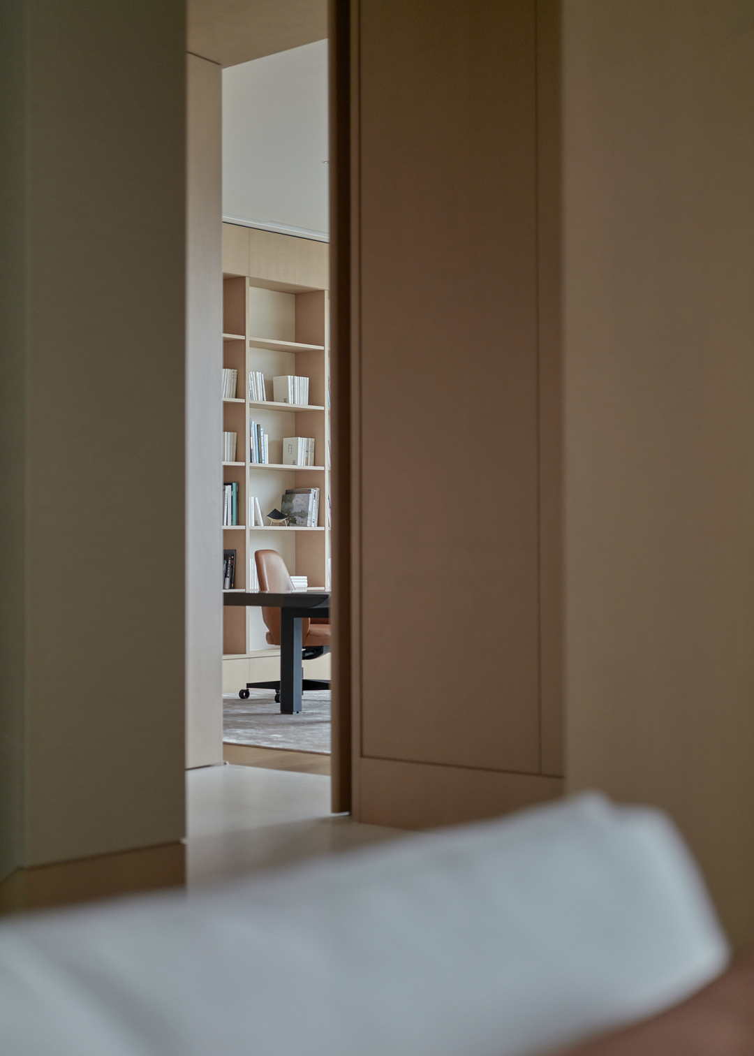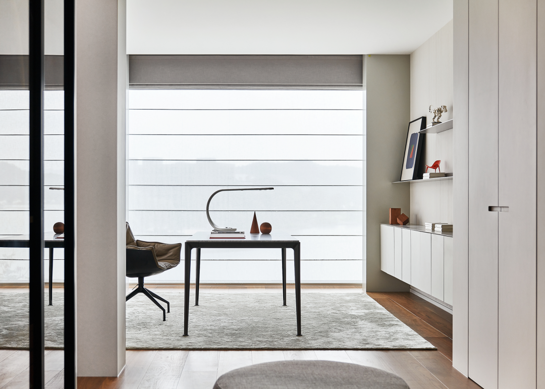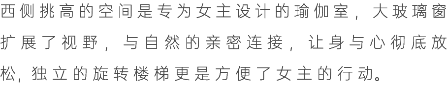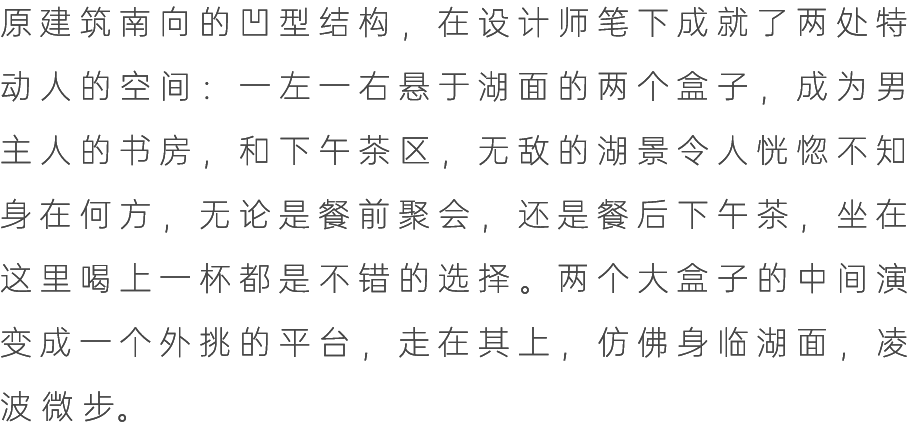当然在空间上,两个套房分列东西,通过起居室相连,都拥有朝南面湖的超宽视野。尤其是儿子房的书房,正落于一层休闲厅上方,拥有270度的环湖视野。