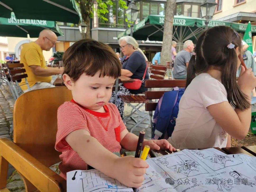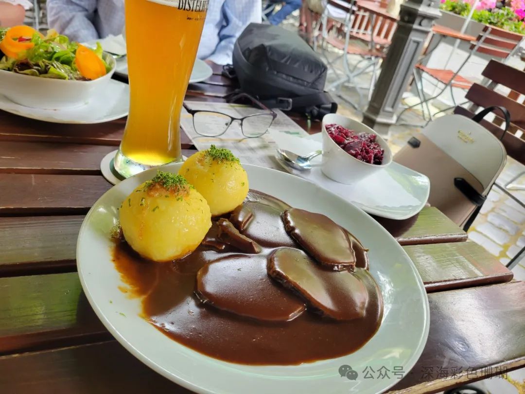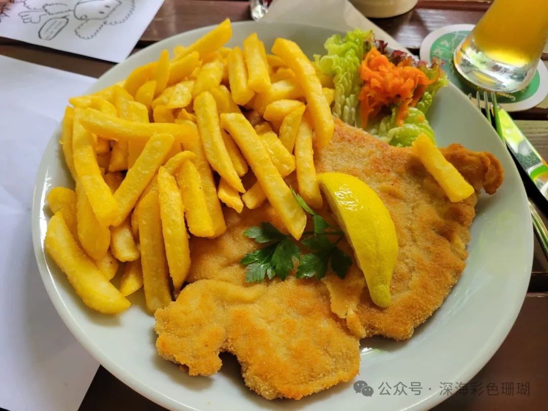 正好今天有集市,老城内很热闹。通常老城的中心一般都是一座教堂,围绕着教堂有一片广场,给举办活动,举办集市。今天的午饭就在教堂外的一家餐馆,坐在露天的餐馆,正好听着教堂的钟声,喝着啤酒,吃着德国炸猪排Schnitzel,Schnitzel是我们接下来好多天的明星菜,因为家里有小孩,都在吃炸的加薯条,点它绝对不出错。
