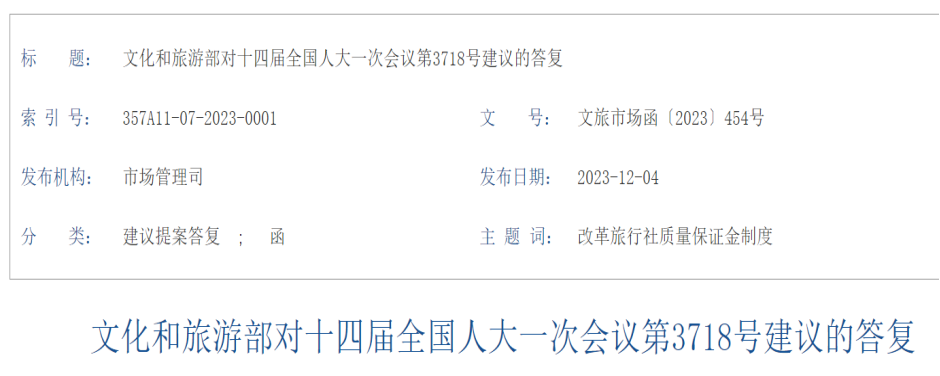 您提出的《关于改革旅行社质量保证金制度的建议》收悉,经认真研究,现答复如下: