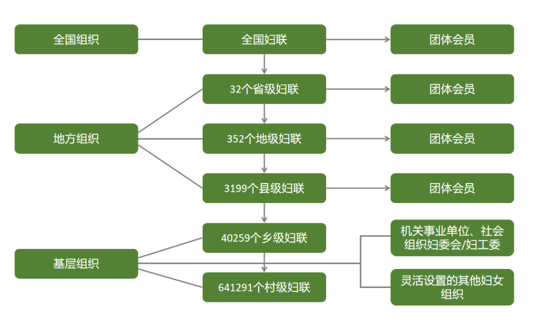 目前,全国妇联的机构设置如下:32个省级妇联,352个地级妇联,3199个县级妇联,40259个乡级妇联,641291个村级妇联。