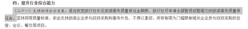 为贯彻落实党中央、国务院对受新冠疫情持续影响行业企业加大扶持力度的决策部署,文化和旅游部自2020年起连续调整保证金政策,支持旅行社纾困解难。目前,旅行社可全额暂退或暂缓交纳保证金,补足保证金期限至2024年3月31日,保证金政策的调整为旅行社企业释放现金流超过96亿元,对有效支持旅行社应对阶段性经营困难发挥了积极作用。
