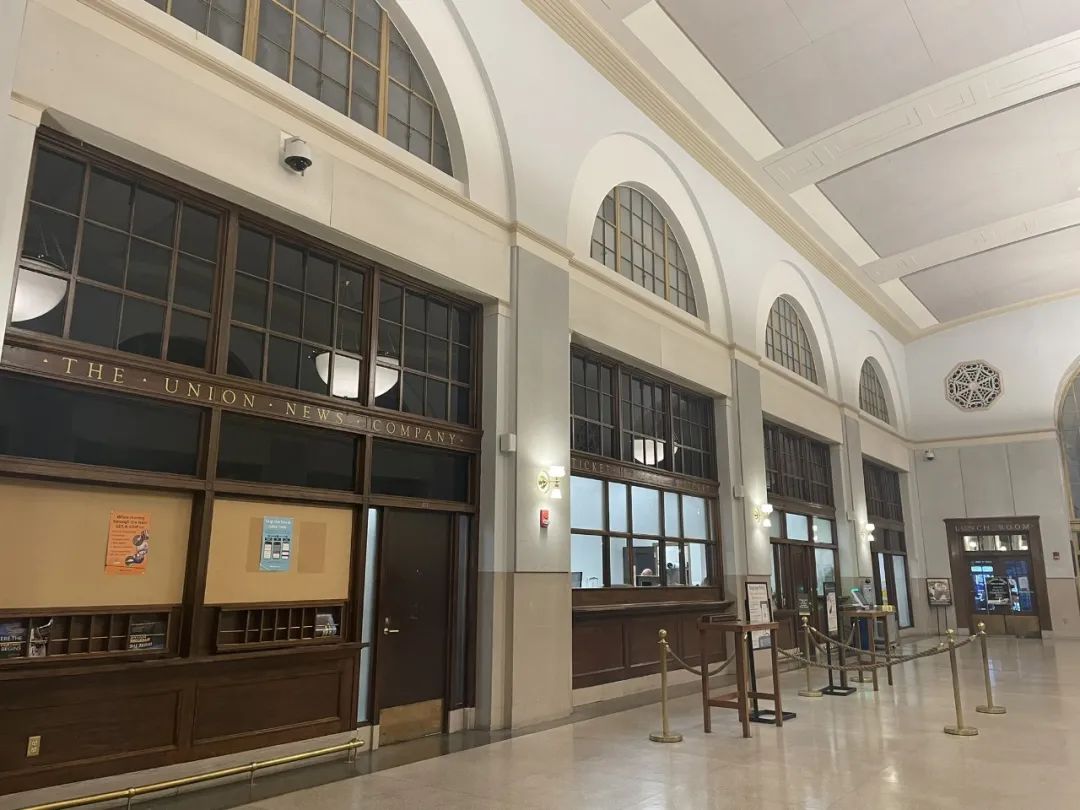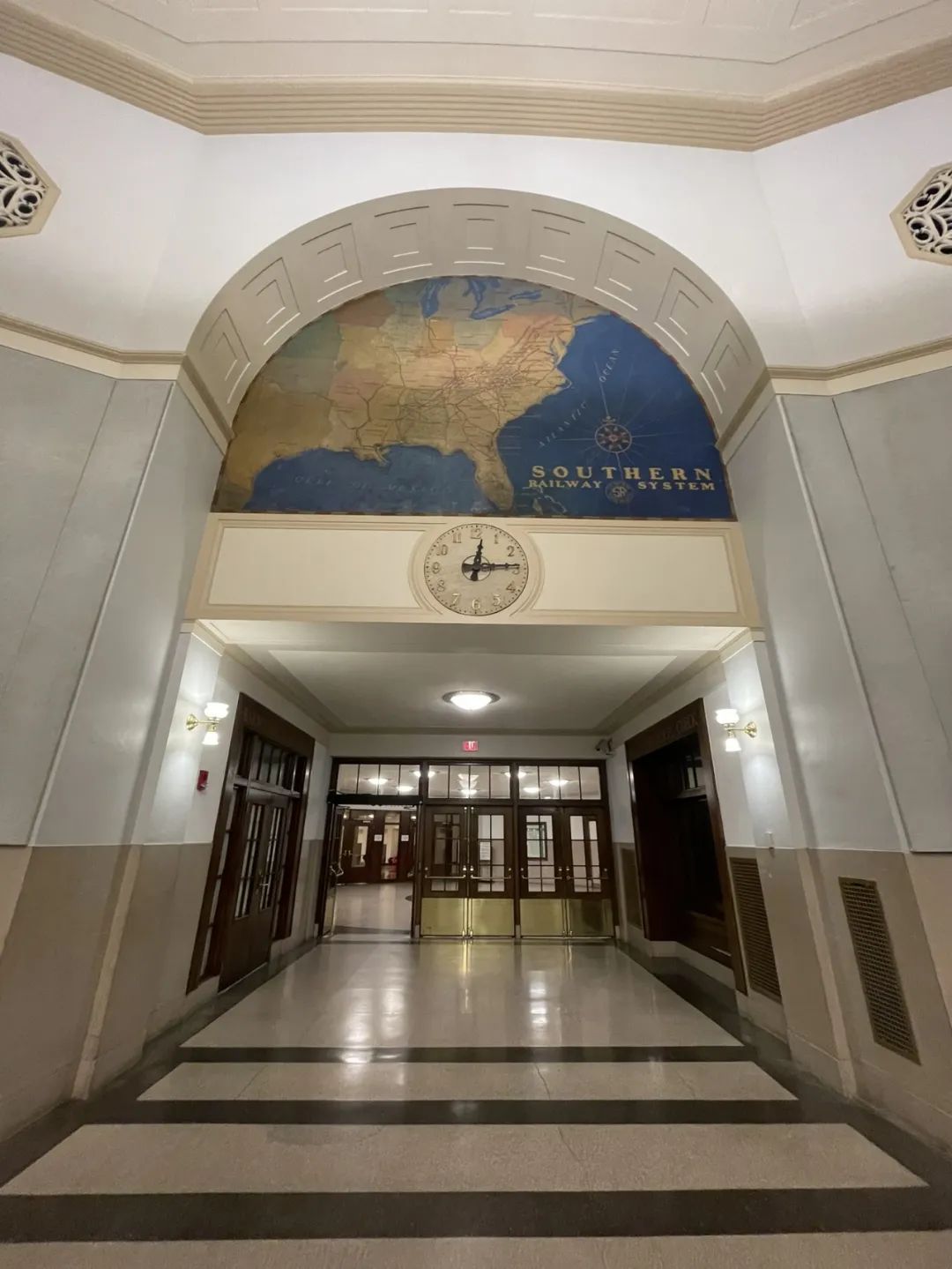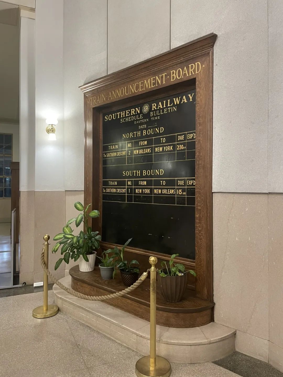 我本来可以从罗利火车站坐通勤火车前往格林斯伯勒,但是换乘时间太久,并且格林斯伯勒火车站提供免费停车,所以我就决定开车去坐火车。火车站在市中心,但晚上十一点多基本没有什么人。车站建于1927年,原本是南方铁道公司的车站,1979年弃用,2005年修缮后重新开放。车站还保留着上世纪初的文雅风韵,高大宽敞的候车厅的正前方是一个美国东部地图,检票处两侧是火车班次信息。候车厅旁边有写着餐厅、理发店等字样的房间,不过餐厅已经改成了小卖部,理发店也不像是还营业的样子。