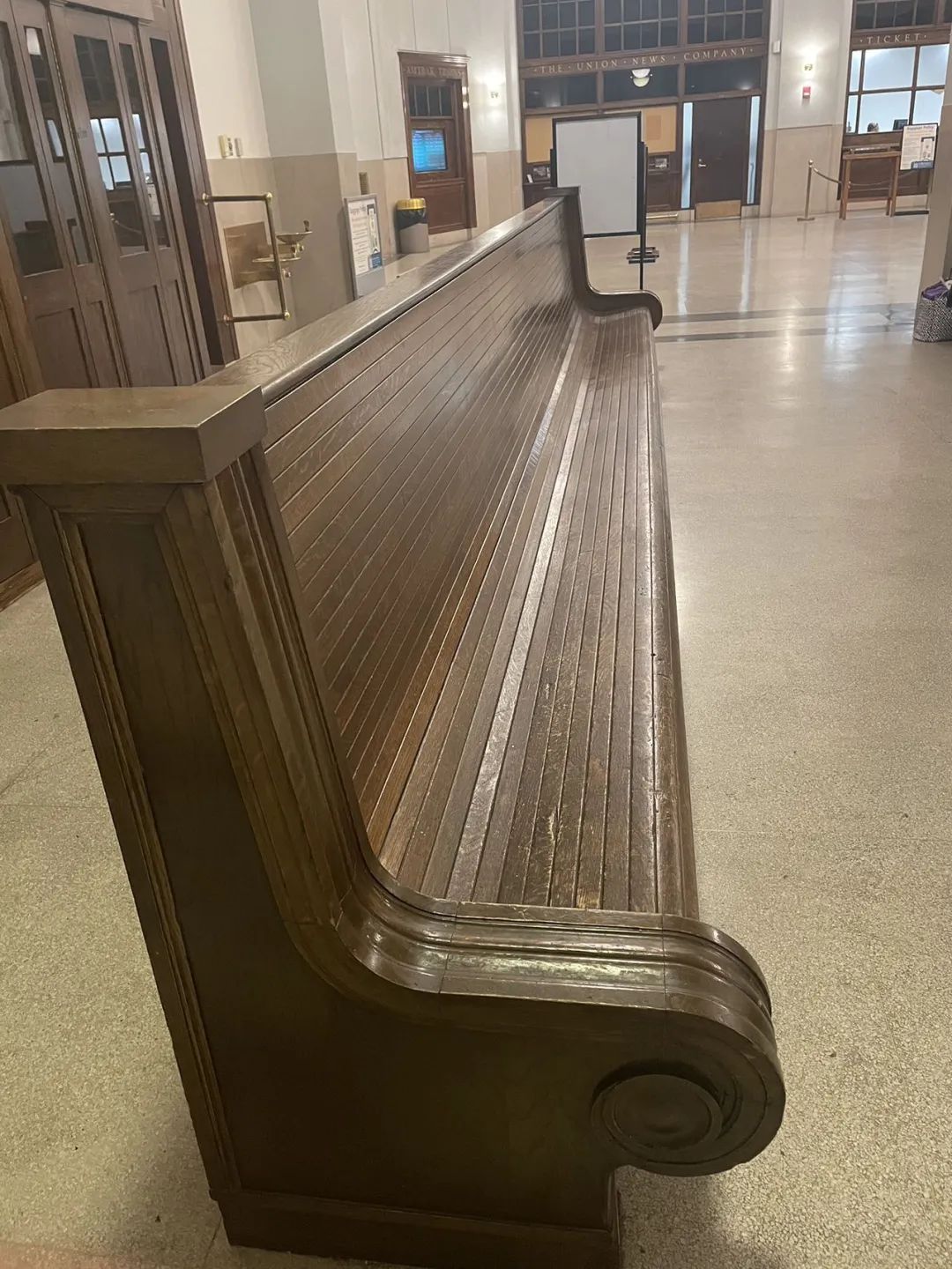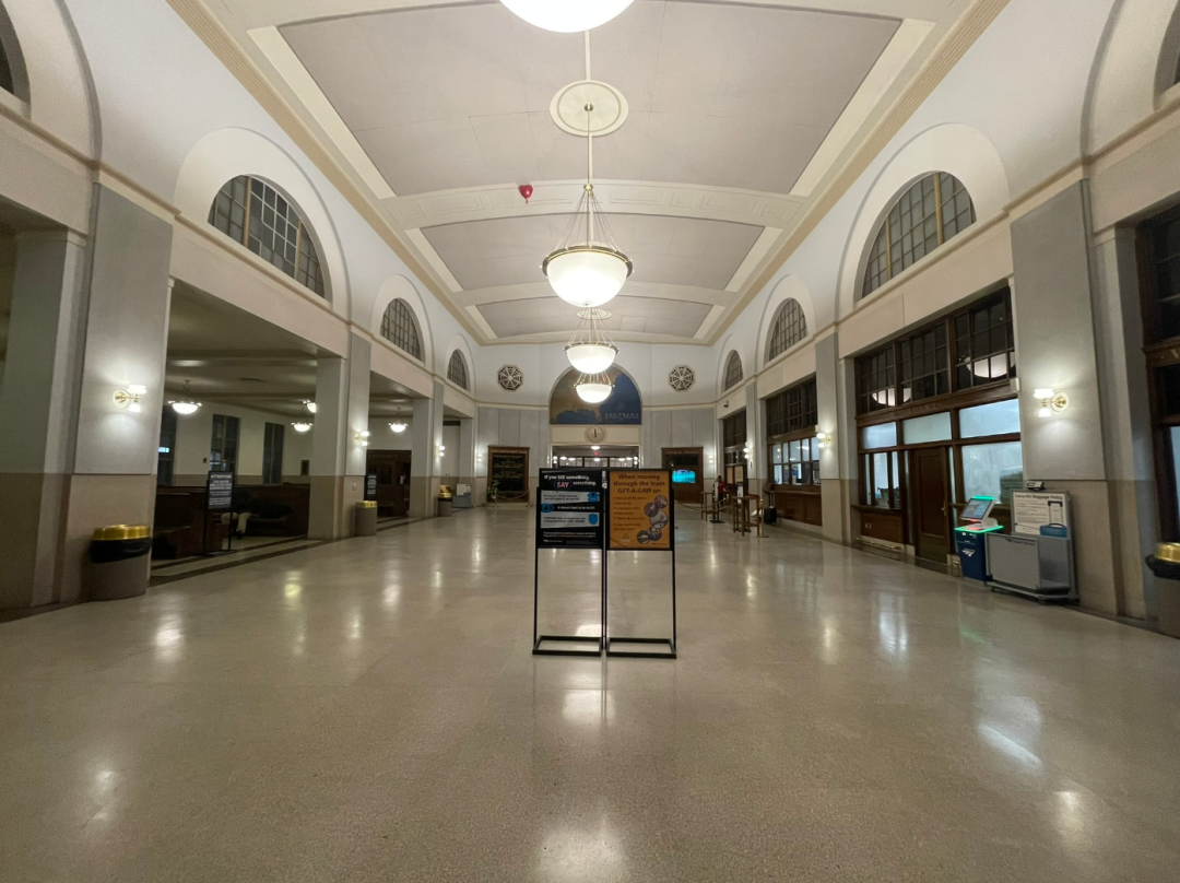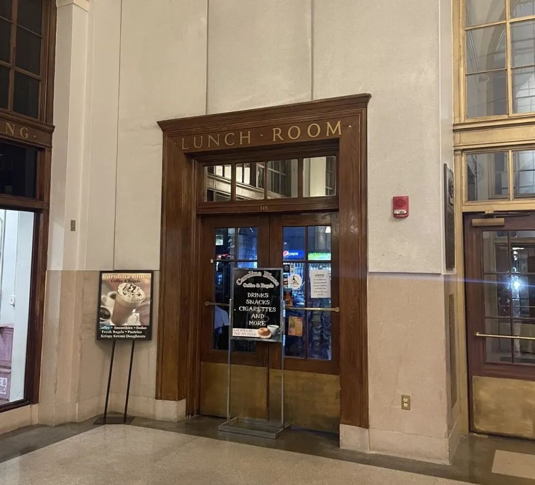 我本来可以从罗利火车站坐通勤火车前往格林斯伯勒,但是换乘时间太久,并且格林斯伯勒火车站提供免费停车,所以我就决定开车去坐火车。火车站在市中心,但晚上十一点多基本没有什么人。车站建于1927年,原本是南方铁道公司的车站,1979年弃用,2005年修缮后重新开放。车站还保留着上世纪初的文雅风韵,高大宽敞的候车厅的正前方是一个美国东部地图,检票处两侧是火车班次信息。候车厅旁边有写着餐厅、理发店等字样的房间,不过餐厅已经改成了小卖部,理发店也不像是还营业的样子。