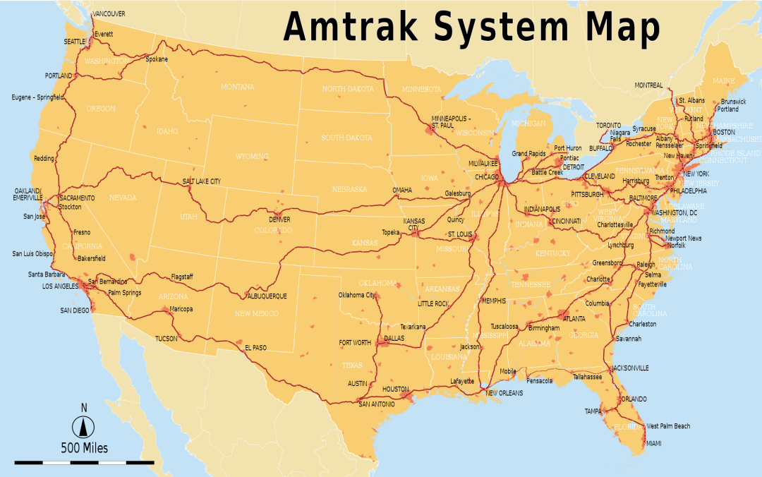 随着二十世纪五十年代美国州际高速公路网的形成,铁路货运量逐渐被卡车吞噬,客运也因为航空旅行的发展而减少。1970年,为了保证铁路客运运营,美国国会和时任总统尼克松决定成立“国家铁路客运公司”,由联邦政府和州政府资助运营,新成立的公司又被称为“美铁(Amtrak)”。因为美国铁路都是私有的,美铁只有东北走廊和其他少数地方拥有自己的铁道,其他的地方都是借用其他铁道公司的货运线路。客运车时常需要给铁道公司自己的货运火车让路,这也是长途客运火车总是晚点的原因。美铁客运铁路线路